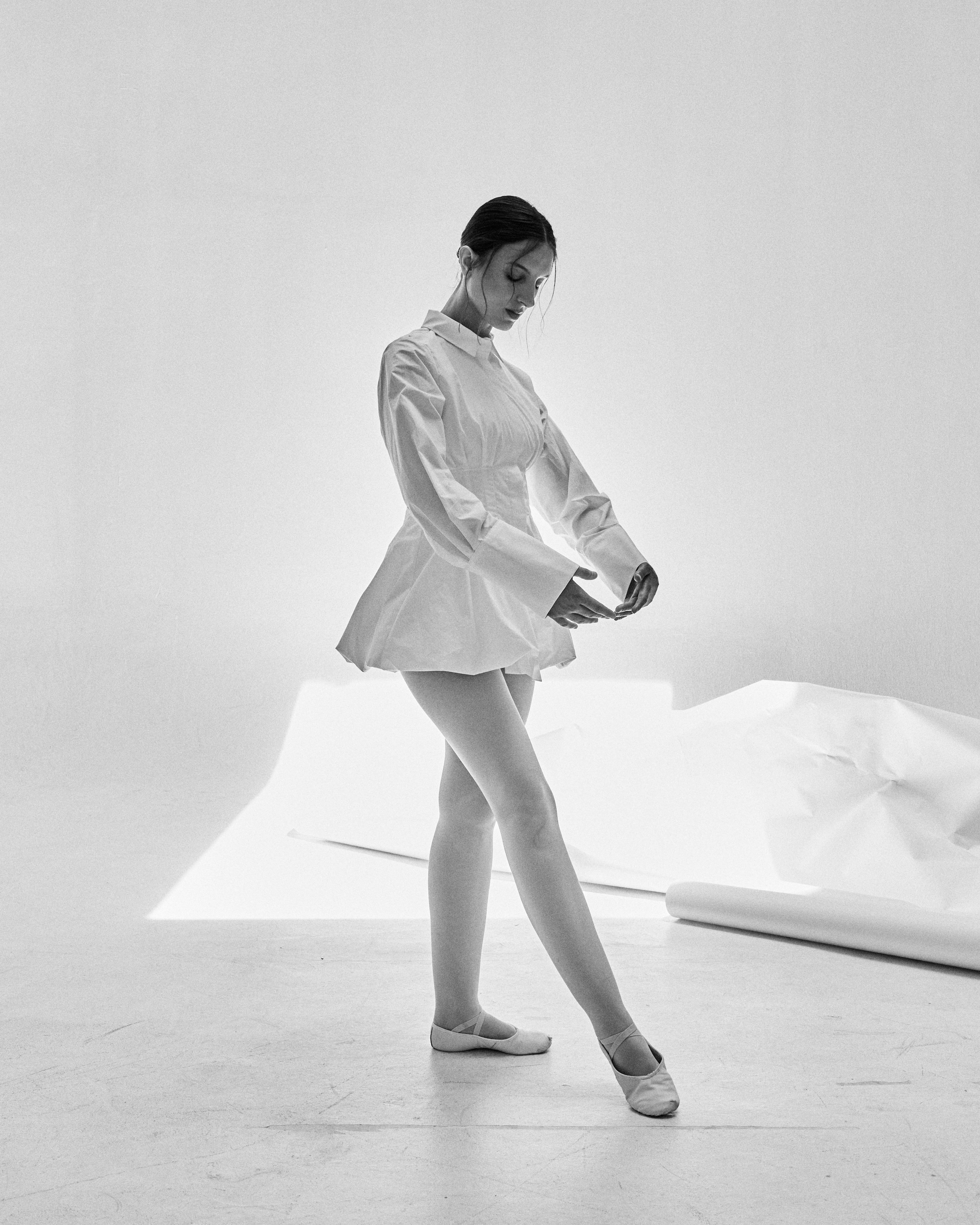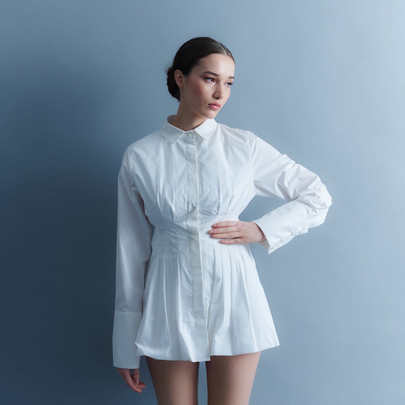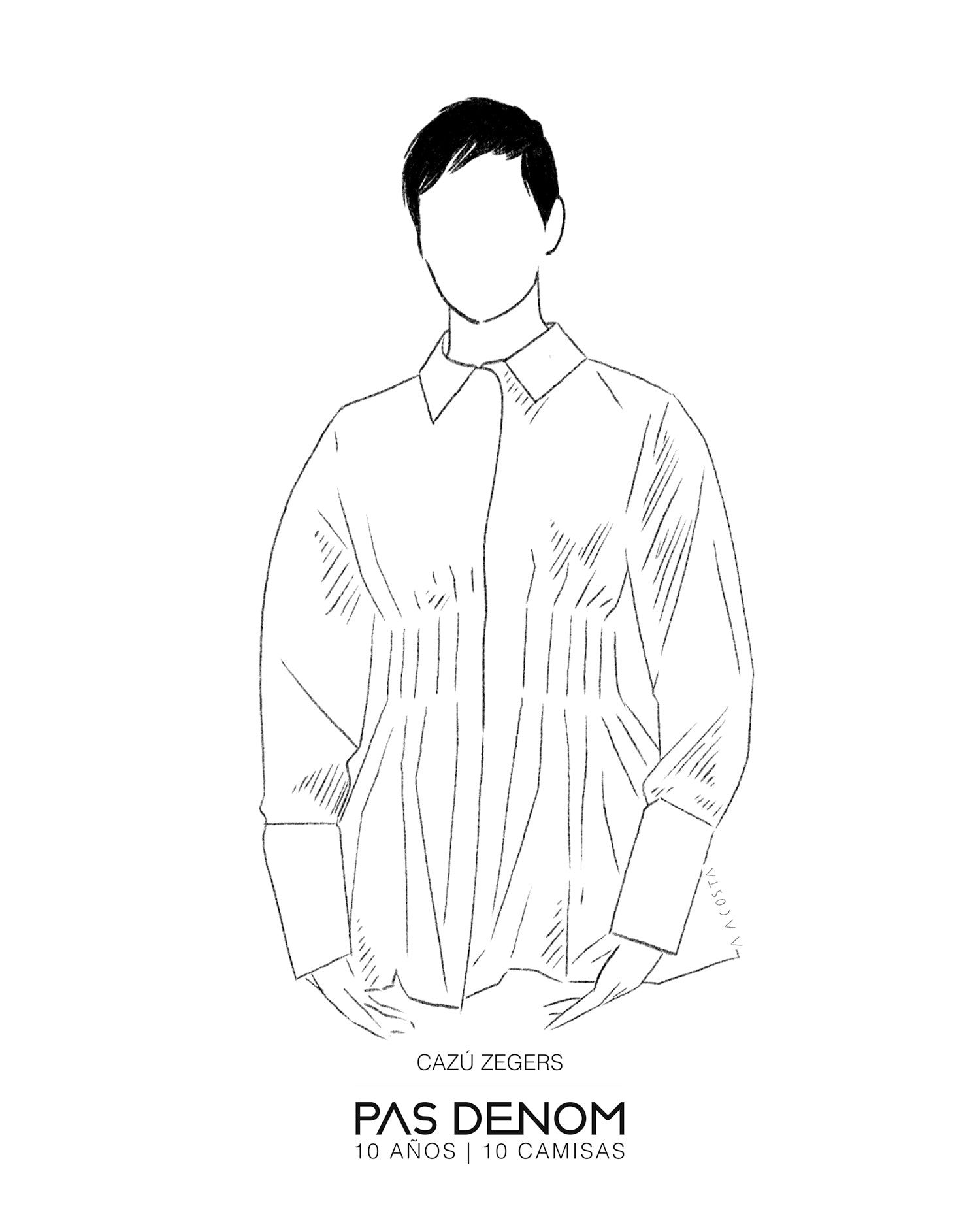 C: Es una pieza indispensable en el closet de una mujer. La camisa blanca es un ícono del vestir masculino, al ser adoptado por la mujer habla del balance entre lo femenino y lo masculino. Para mi el diseño de mi camisa, tuve en consideración estas dos cosas, por ello la respuesta que toma una camisa masculina clásica , mantiene lo masculino, masculina en su parte superior, cuello y mangas -símbolos de fuerza- y se ajusta por medio de pinzas a partir del bajo busto y en la base se cierra como un globo, elementos de lo esencialmente femenino.