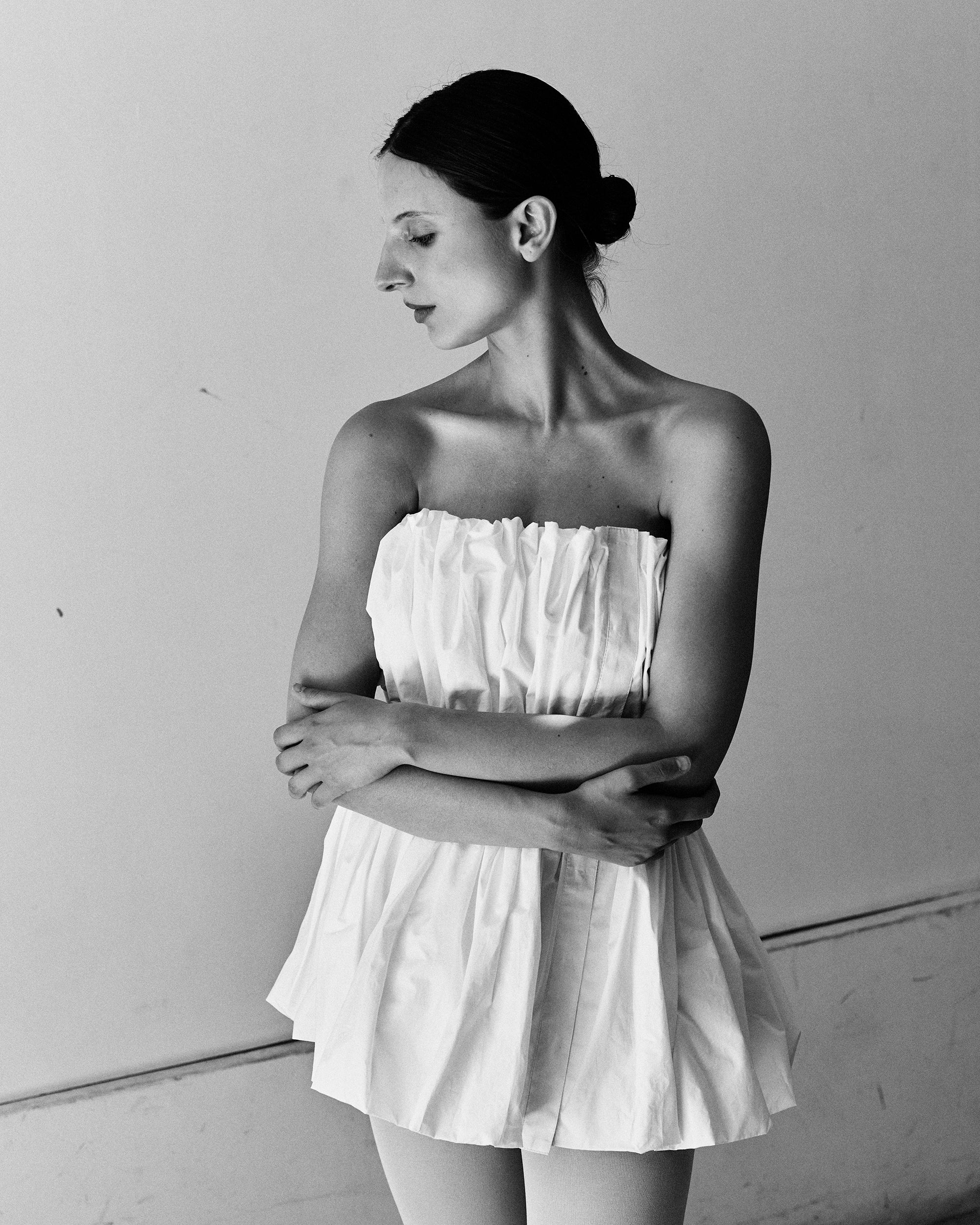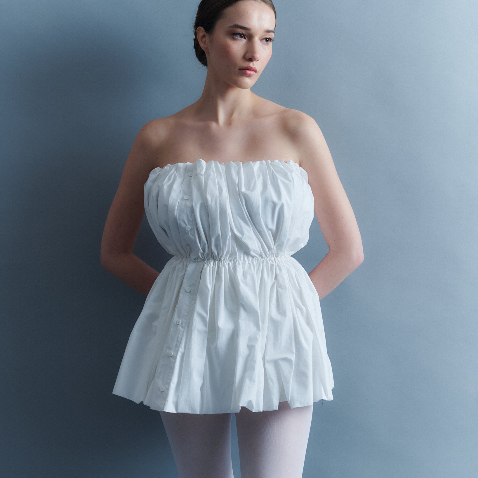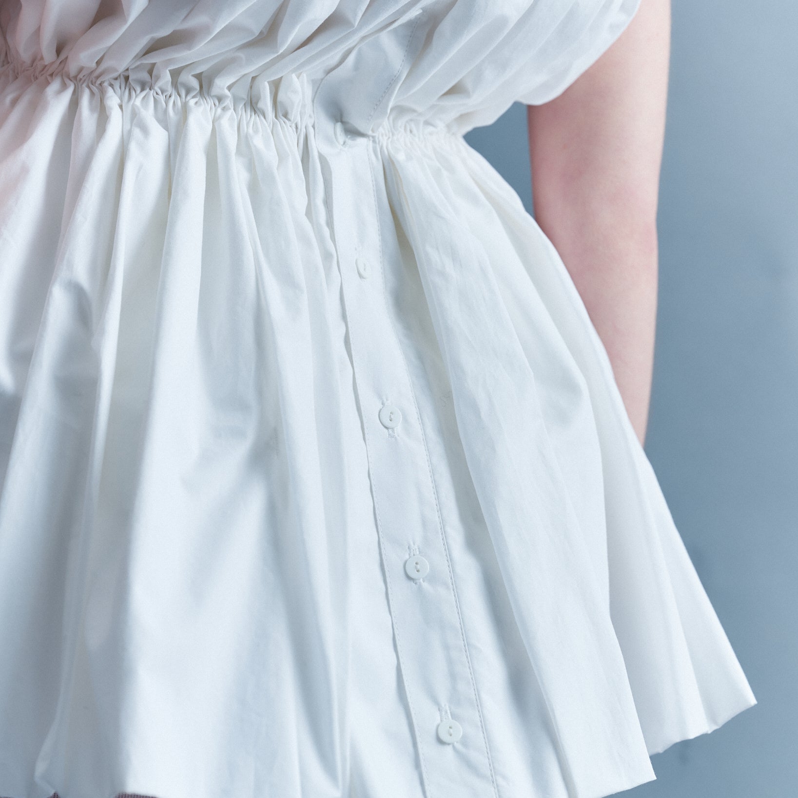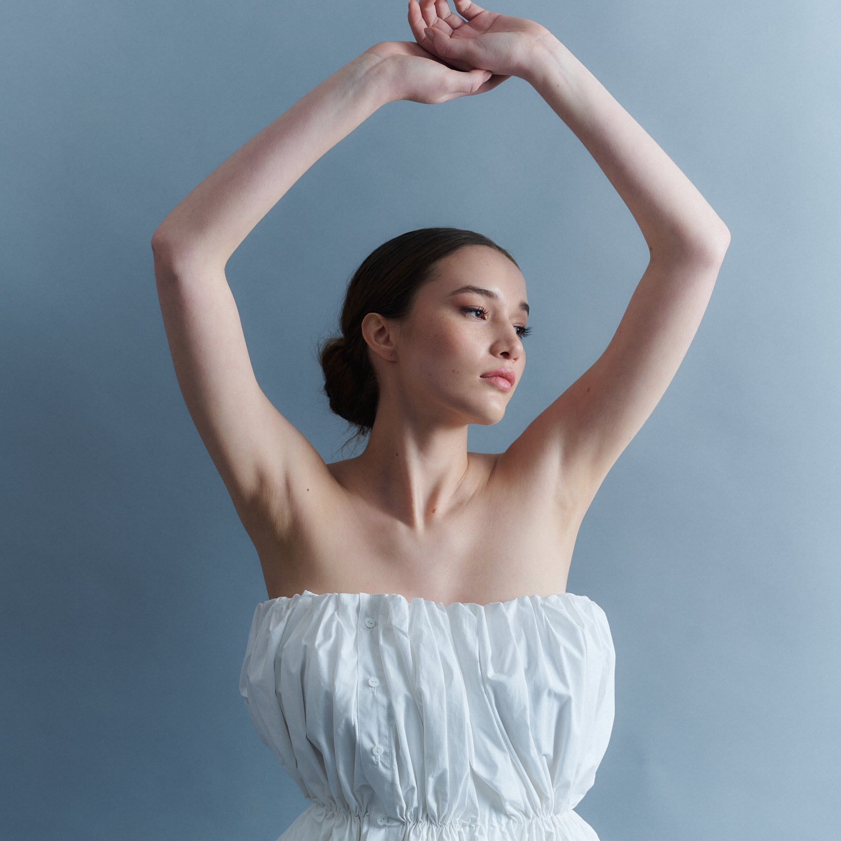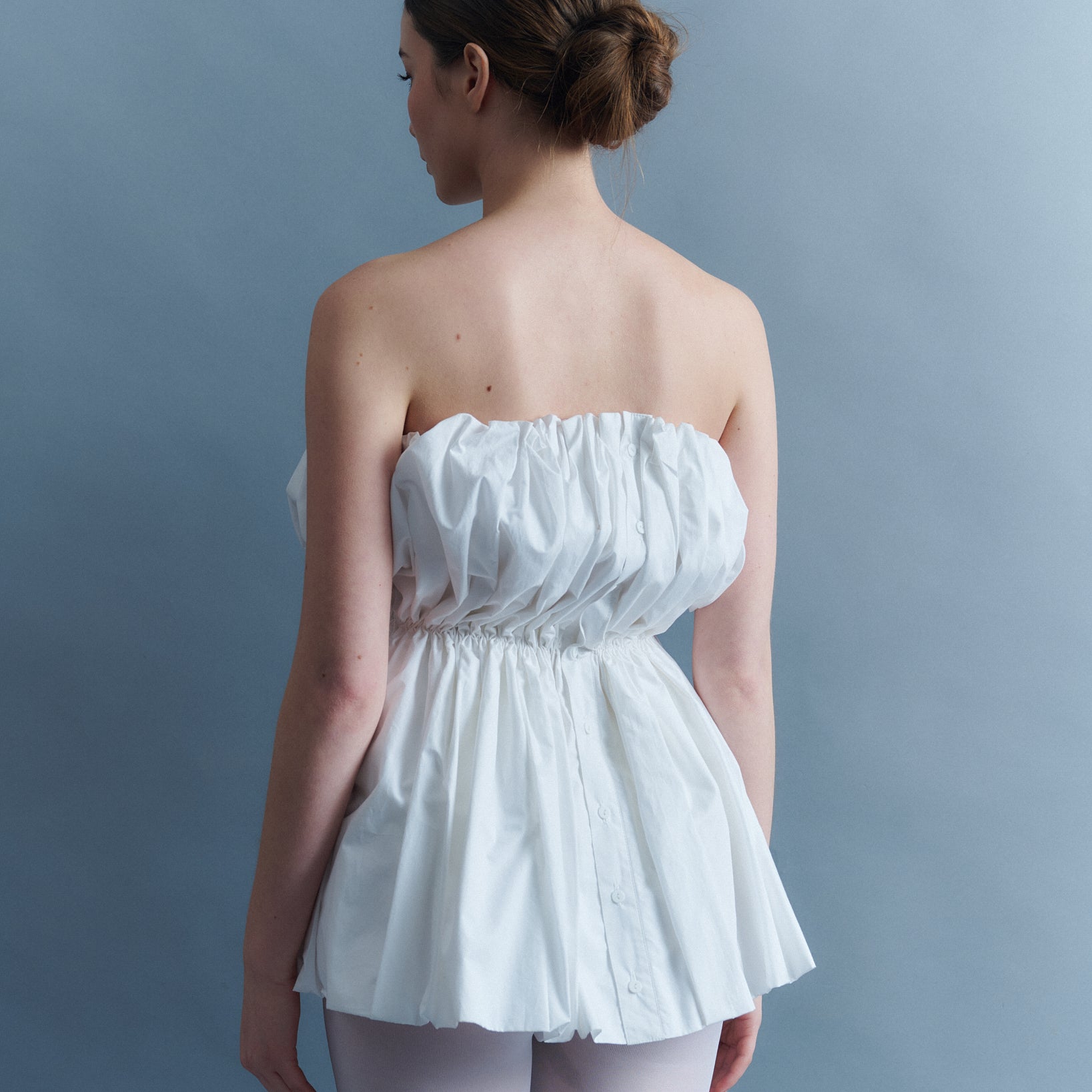 Mi obra busca poner en valor las materialidades con las que trabajo, resaltando sus atributos y posibilidades. En este caso, me interesaba destacar las cualidades de la popelina blanca: un material que, al ser fruncido, adquiere una nueva dimensión, creando volúmenes y relieves que aportan una aproximación más escultórica a la prenda. A su vez, integré el concepto de zero waste, diseñando un patrón rectangular que se estructura a partir del fruncido, optimizando el uso del textil y reduciendo al mínimo el desperdicio. Para mí era muy importante que la pieza resultara interesante desde lo creativo y lo conceptual, pero también que fuese una prenda que yo misma elegiría usar.