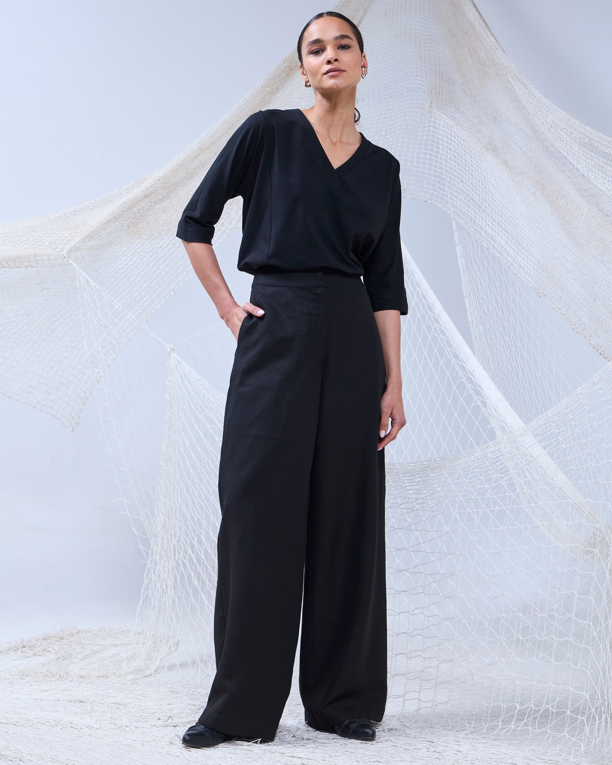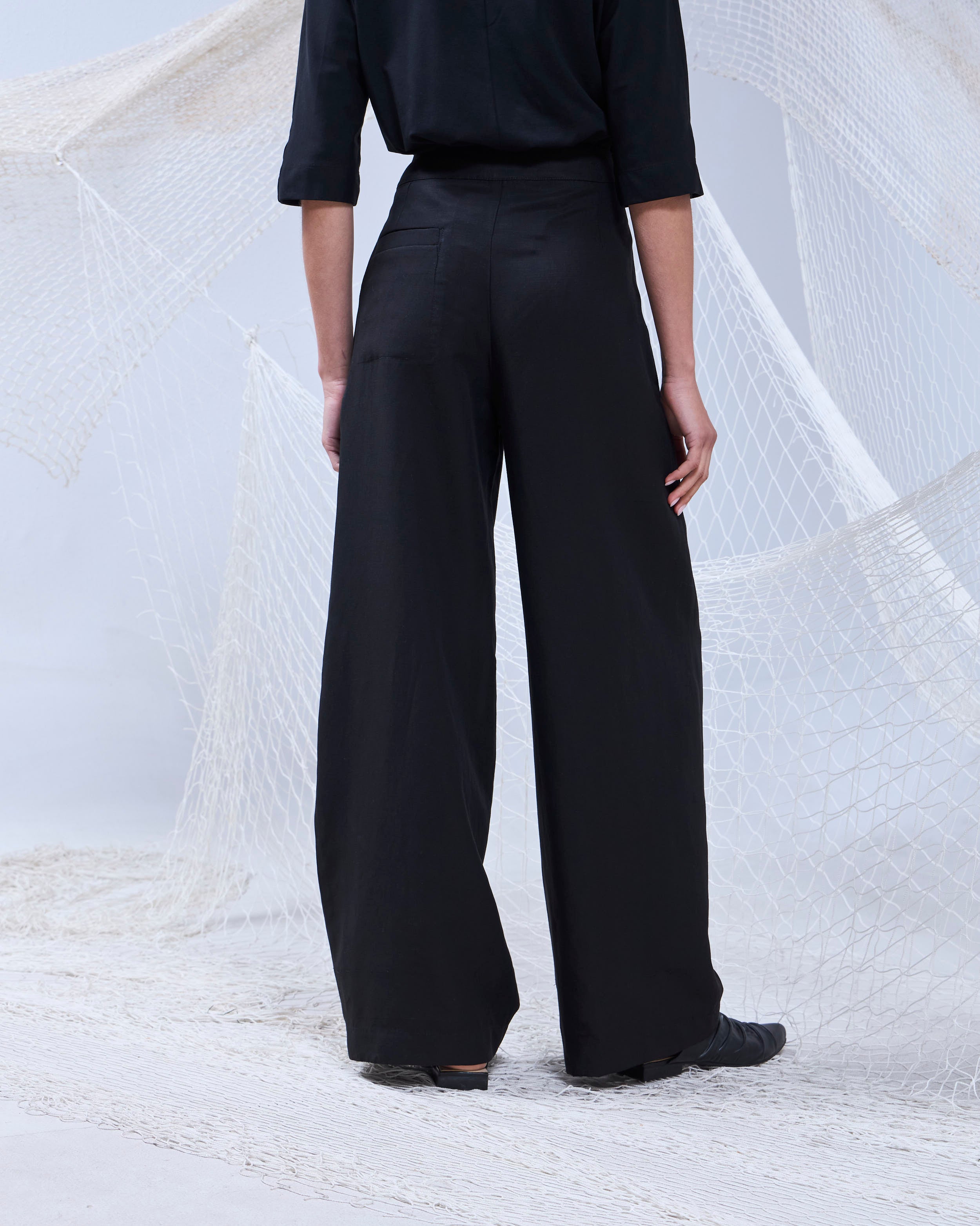 Confeccionado en lino lyocell, el pantalón AKIBARE tiene calce palazzo, tiro alto y bolsillos laterales funcionales. Su silueta amplia y vaporosa proporciona libertad de movimiento, mientras que la caída fluida de la tela asegura un look elegante y relajado, ideal para distintas ocasiones del día a día.Un pantalón esencial para cualquier conjunto de verano.