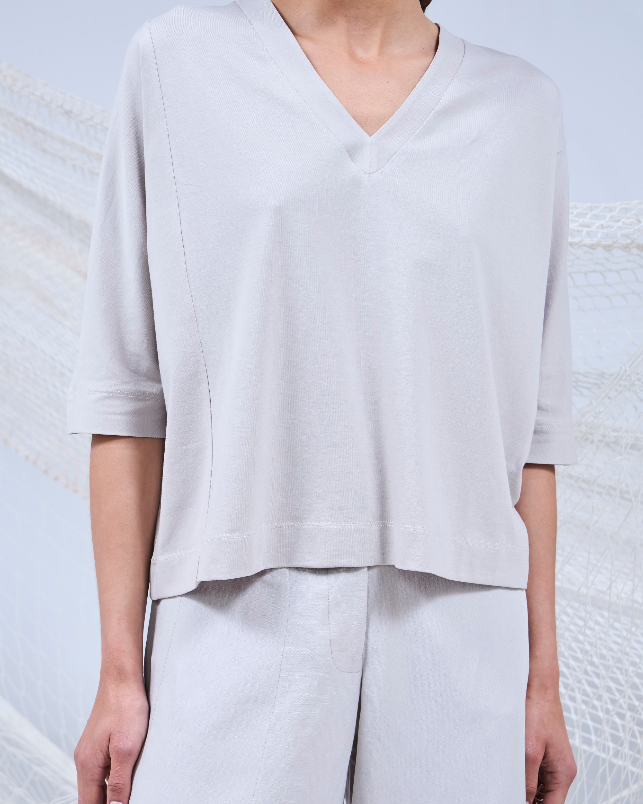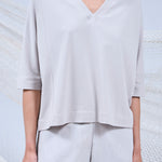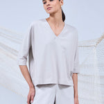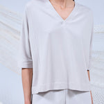 Confeccionado en algodón pima orgánico y spandex, nuestro top AMAE, tiene escote en V, manga corta y calce recto. Su largo hasta la cadera asegura un ajuste funcional que acompaña el movimiento sin restringirlo.