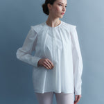El diseño exclusivo de Carolina del Piano, destacada decoradora chilena, refleja su visión estética y atención al detalle. Esta camisa de silueta recta con pliegues delicados, hombros altos y escote chanel es una reinterpretación elegante y poderosa de la prenda clásica.