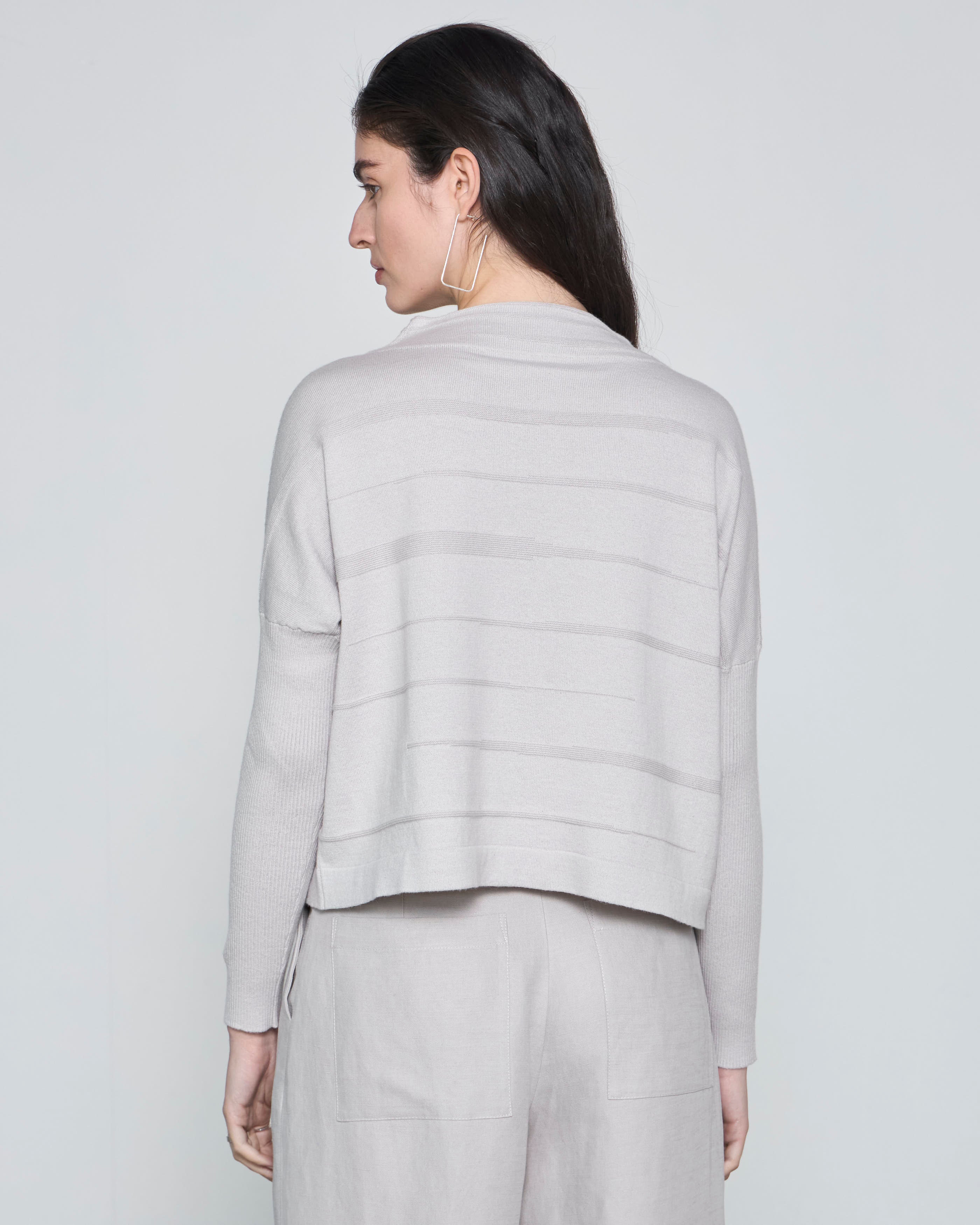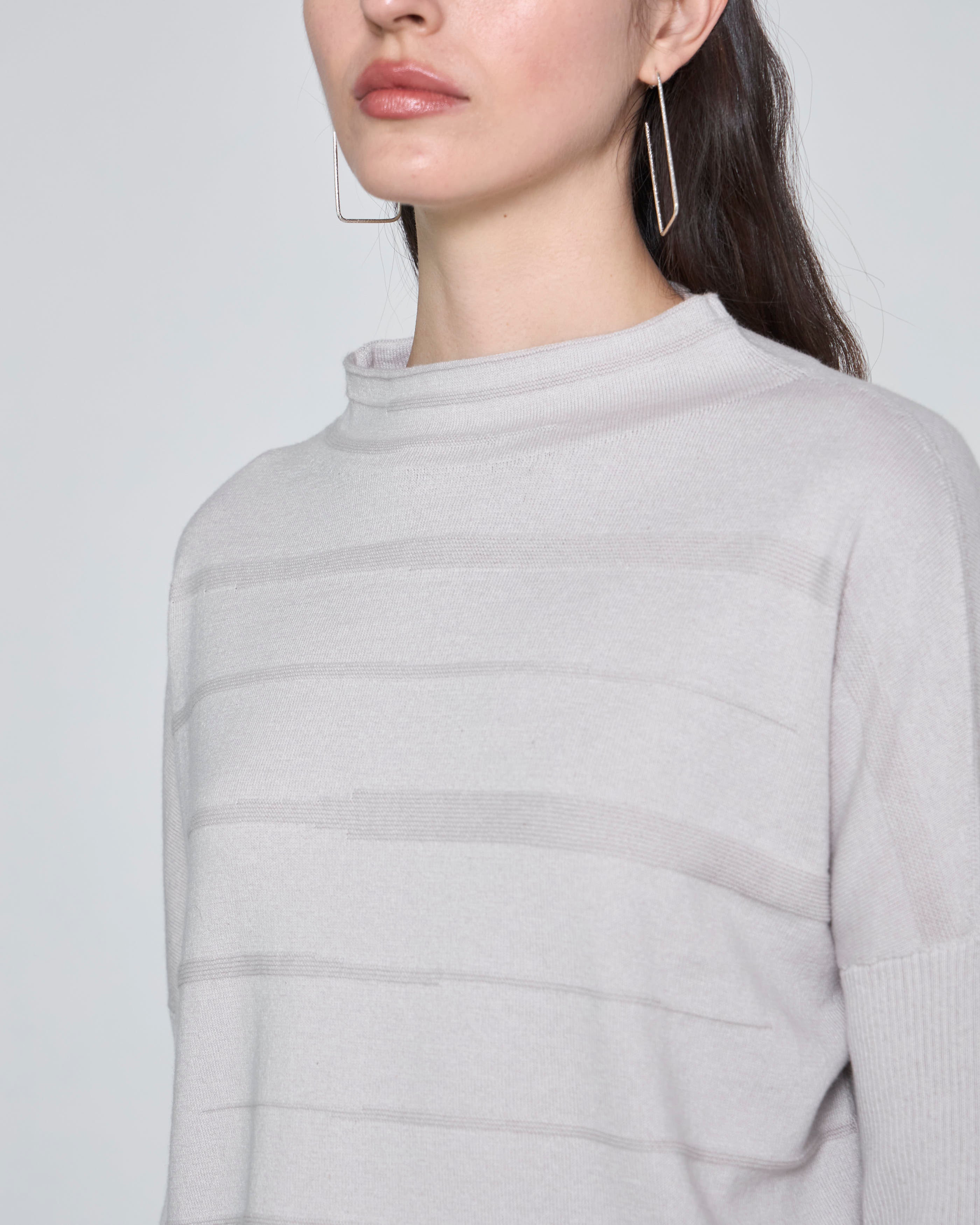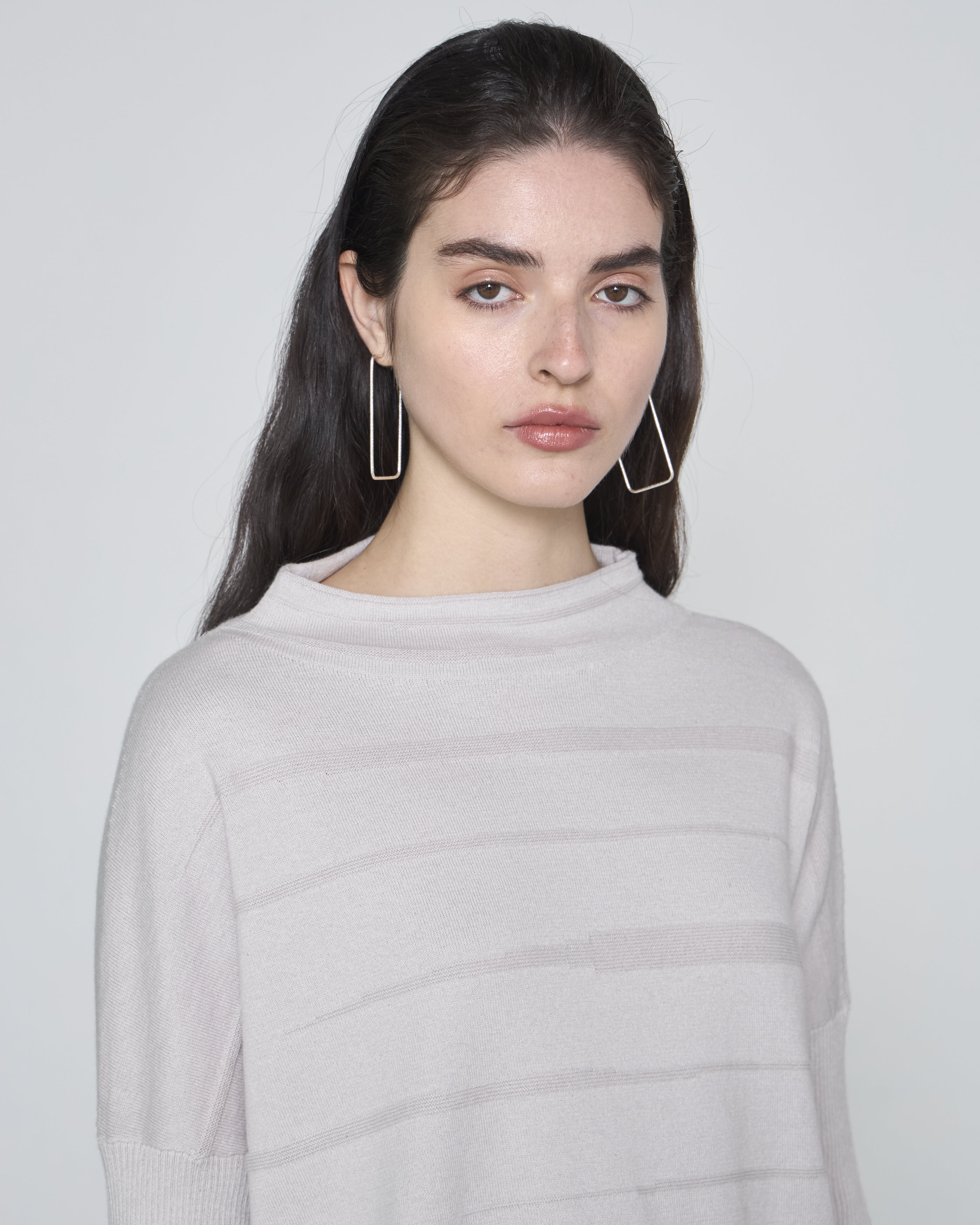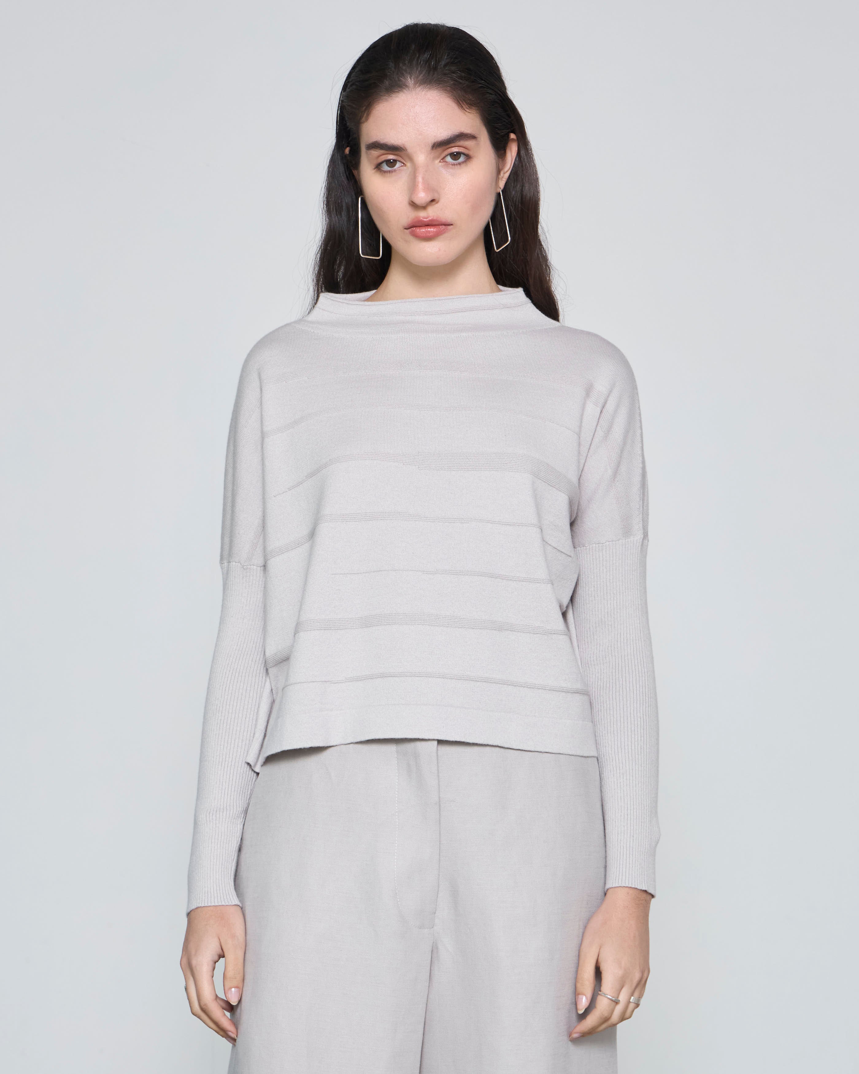 Nuestro tejido CARSON es uno de los tejidos protagonistas de esta temporada: un top oversize, crop y de escote alto, confeccionado en un hilado de baby alpaca y algodón pima peruano.