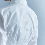 En la espalda, al centro y como referencia a la columna, nace desde la cadera una flor que asciende hasta lo alto, bordada a mano , por la artista textil Janina Kalafatovic, en el mismo tono blanco de la camisa. Una imagen poderosa y significativa para Cazú.