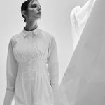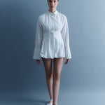Con cuello camisero y mangas clásicas de camisa blanca, su estilo corsé se destaca por una cintura ajustada que realza la figura femenina. El cuerpo abombado, combinado con una abotonadura escondida, crea una silueta elegante y moderna. El plisado que recorre toda la prenda añade un toque único, marcando y realzando la figura con exquisita delicadeza.