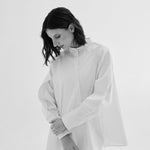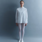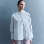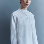 El diseño exclusivo de María Ester Elton, una mujer vanguardista con un enfoque único en la moda. Esta camisa de escote Mao con abotonadura asimétrica es una reinterpretación moderna de la clásica prenda.