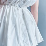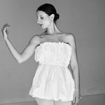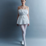 Su silueta abombada y acinturada evoca el estilo de las camisas tipo corsé de épocas pasadas, mientras que su cuerpo completamente plisado añade un aire de feminidad sofisticada. Una pieza que combina la tradición con la modernidad, creando una prenda única que resalta la figura femenina con delicadeza y elegancia.