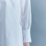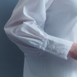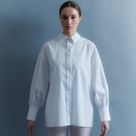 Su elegante cuello camisero, la abotonadura escondida y las solapas en la espalda crean una silueta refinada. Las mangas, con puño amplio y abombadas, aportan un aire moderno y distinguido. Una pieza que no solo resalta por su diseño, sino por la calidad excepcional de los materiales que la componen.