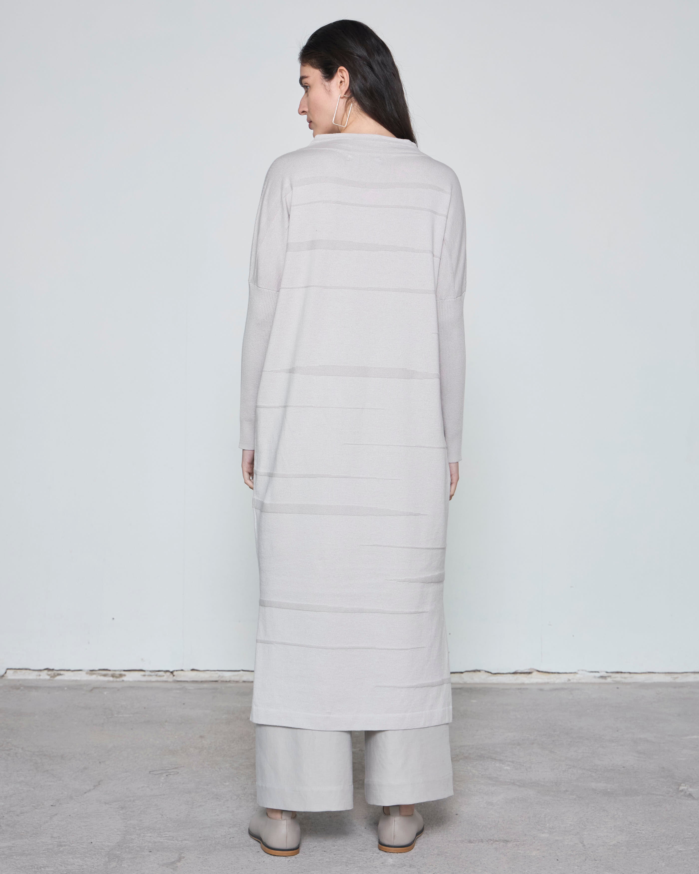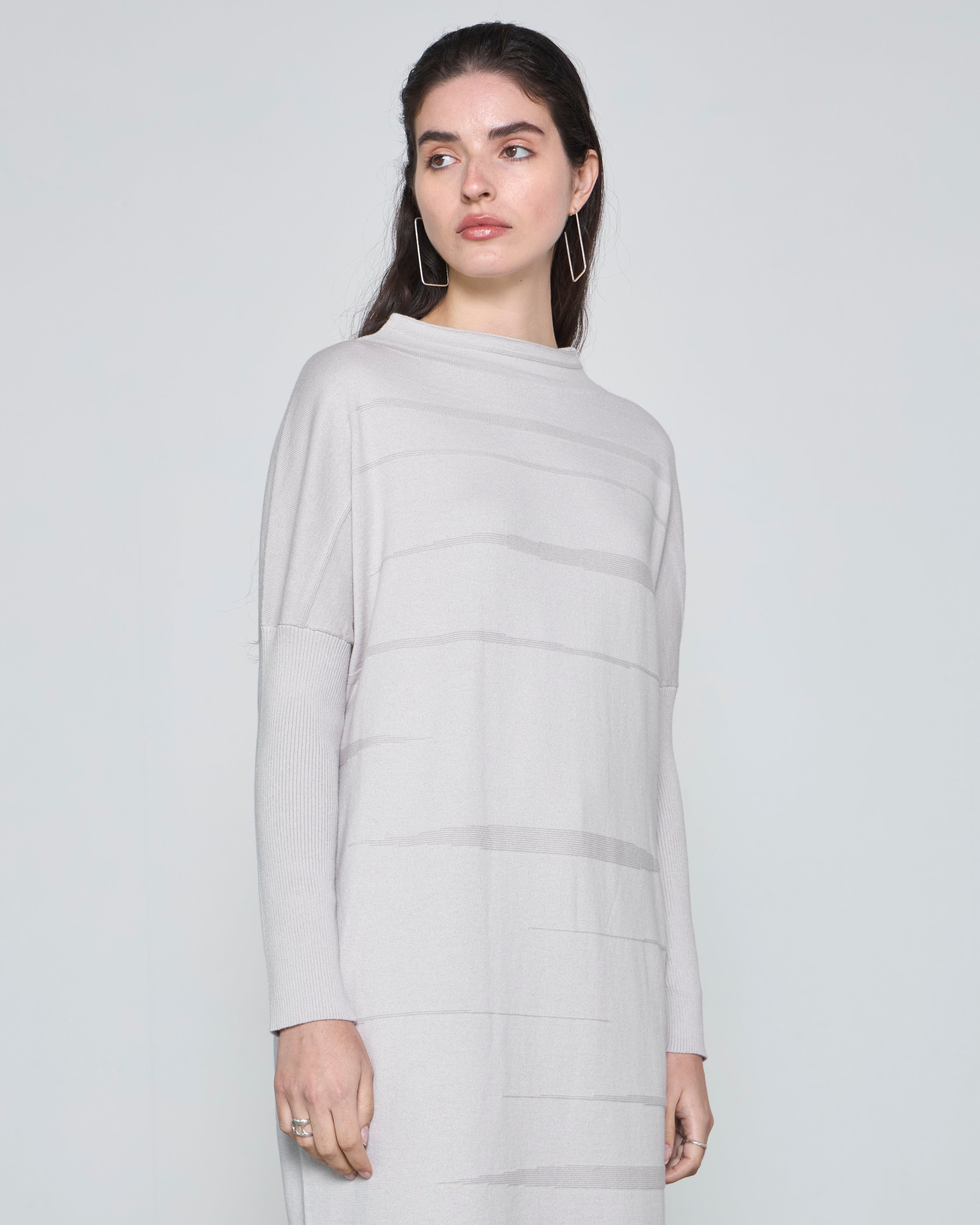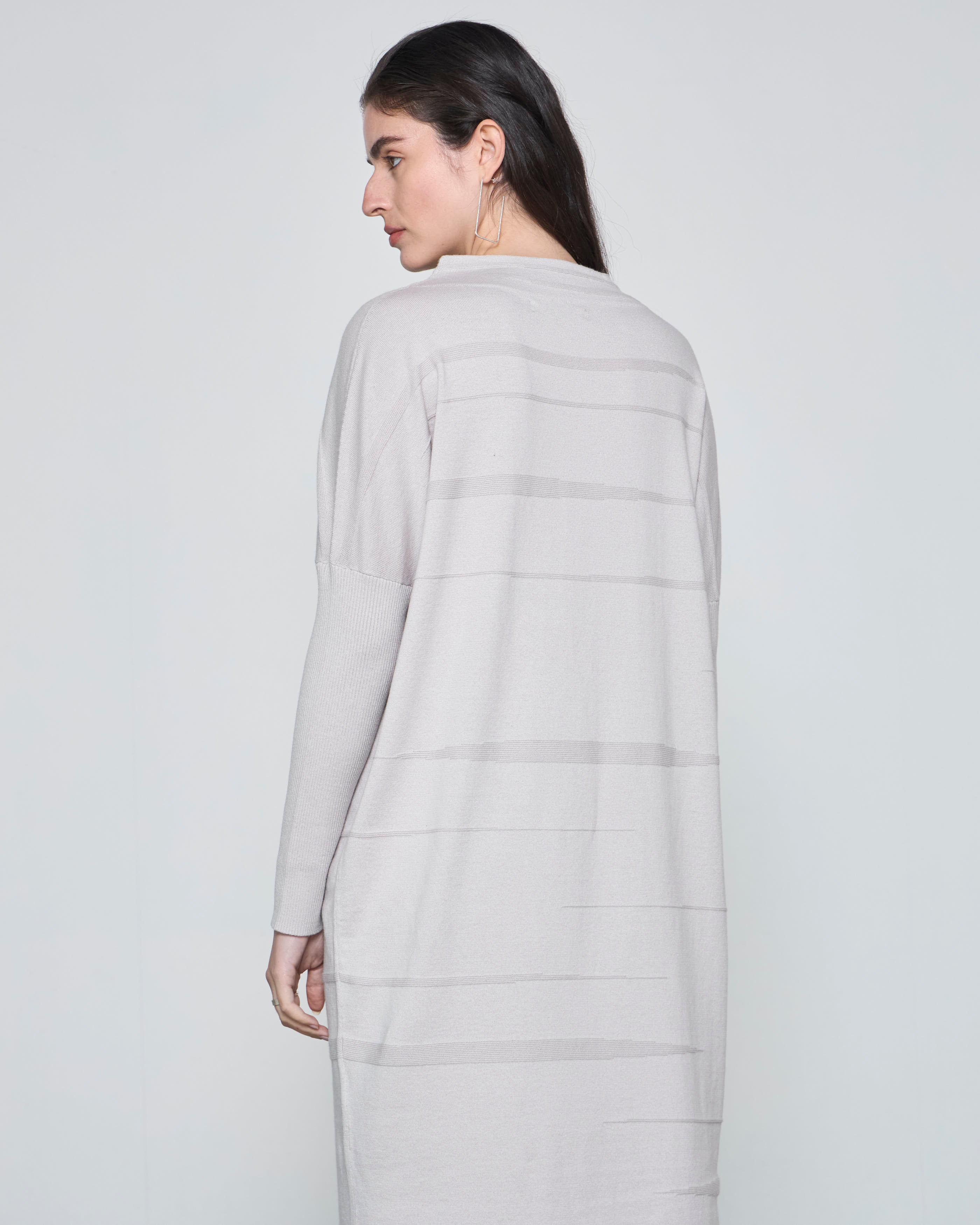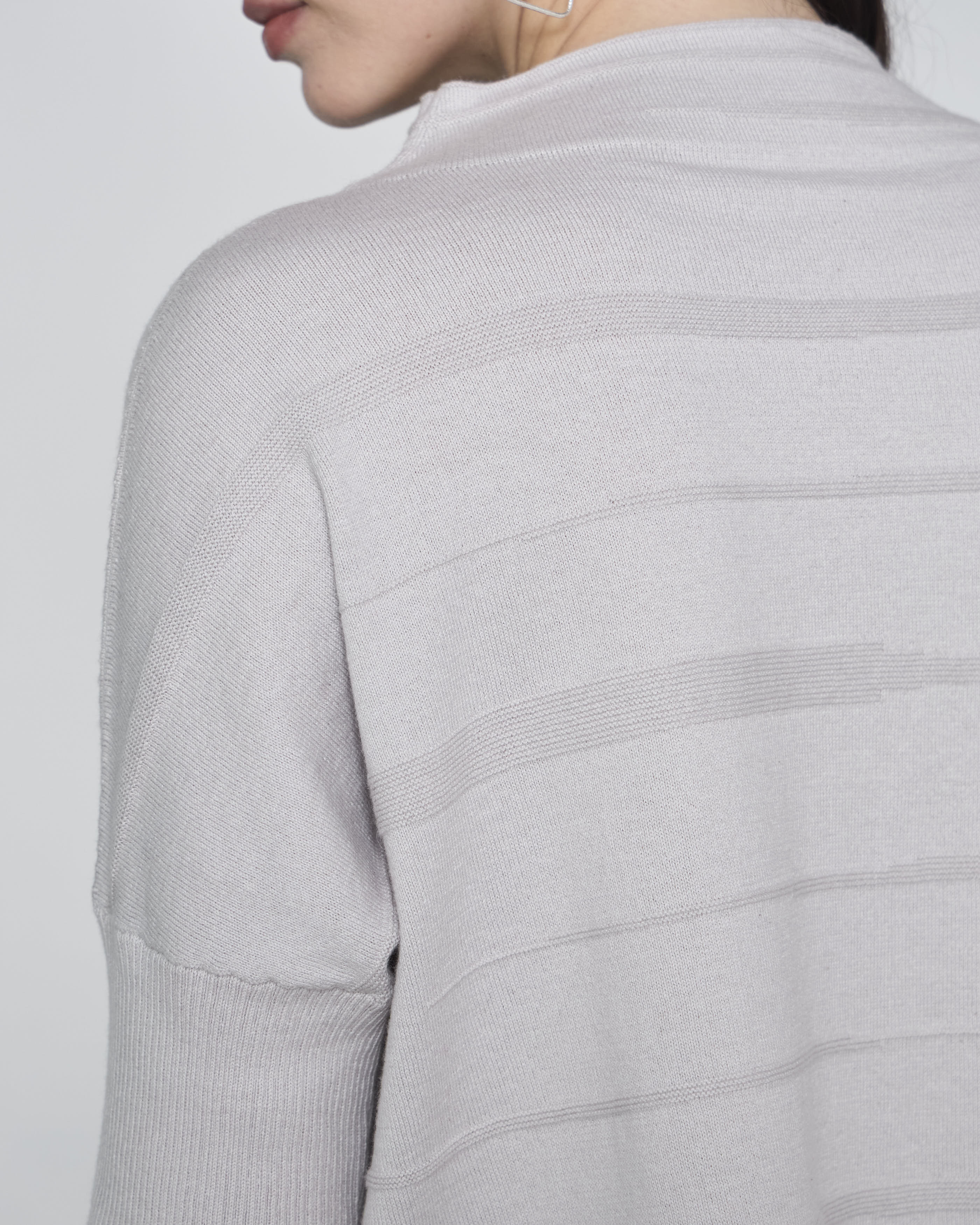 - Diseño fluido: escote alto y mangas rib, con una caída natural que aporta elegancia relajada.