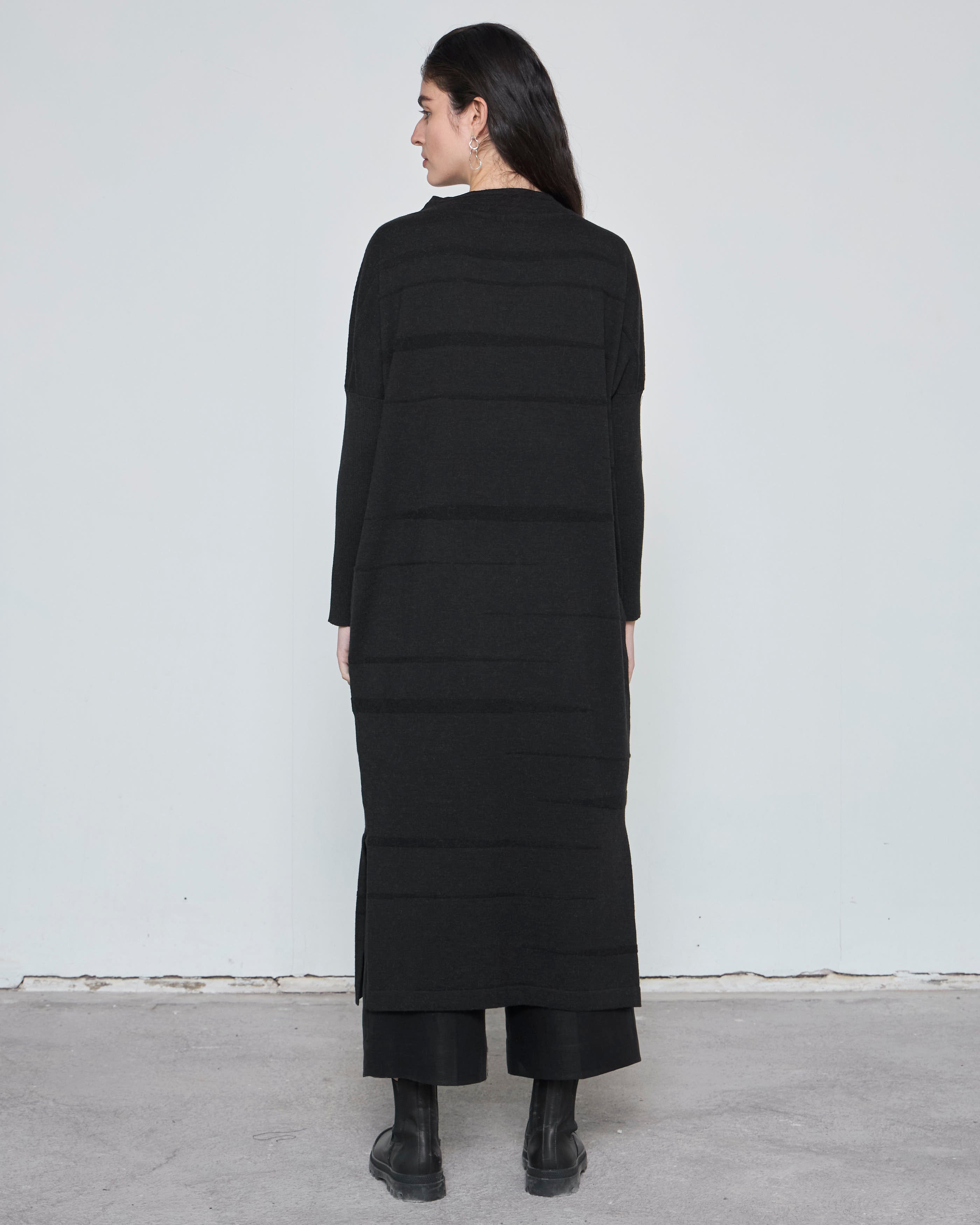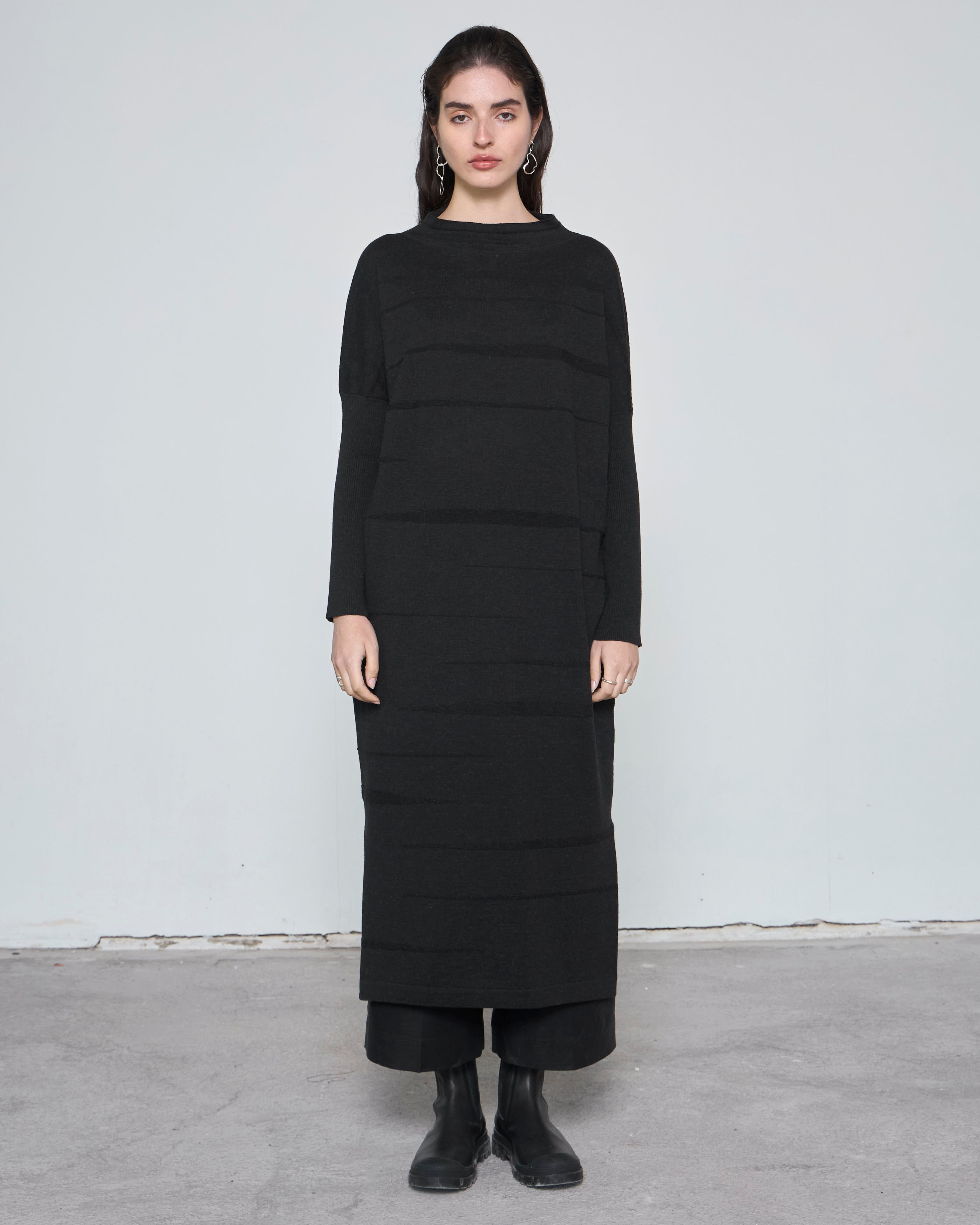 Nuestro NAOMI Maxi Vestido tejido combina elegancia y confort con su escote alto, mangas rib y hombro caído, creando una silueta fluida y sofisticada. Su corte largo y caída natural brindan una elegancia relajada, perfecta para el invierno. Confeccionado en una mezcla de baby alpaca y algodón pima, su desarrollo de punto especial Pas Denom genera una textura única que aporta profundidad y sofisticación, manteniéndote abrigado y cómodo con una transpirabilidad superior, ideal para el frío.