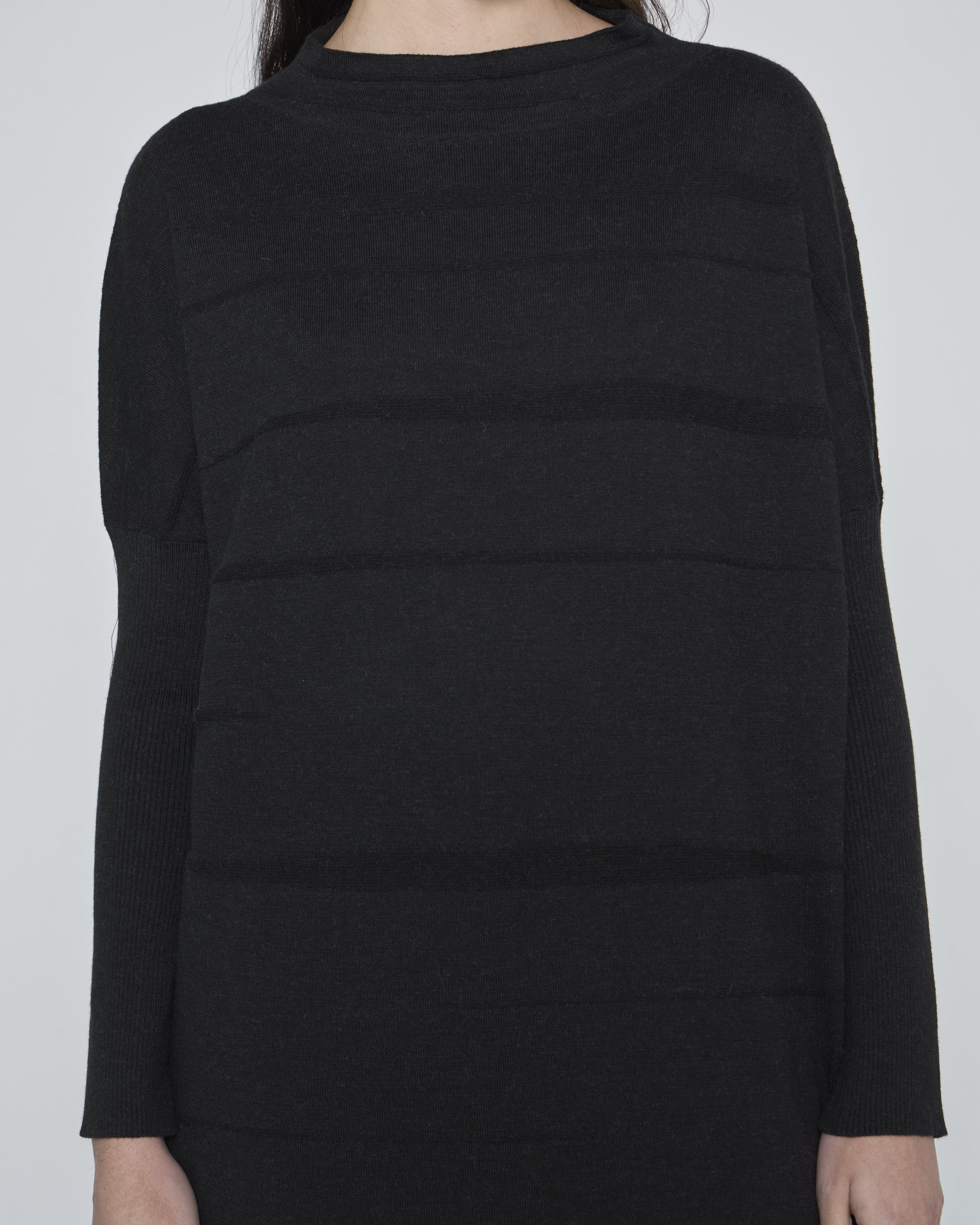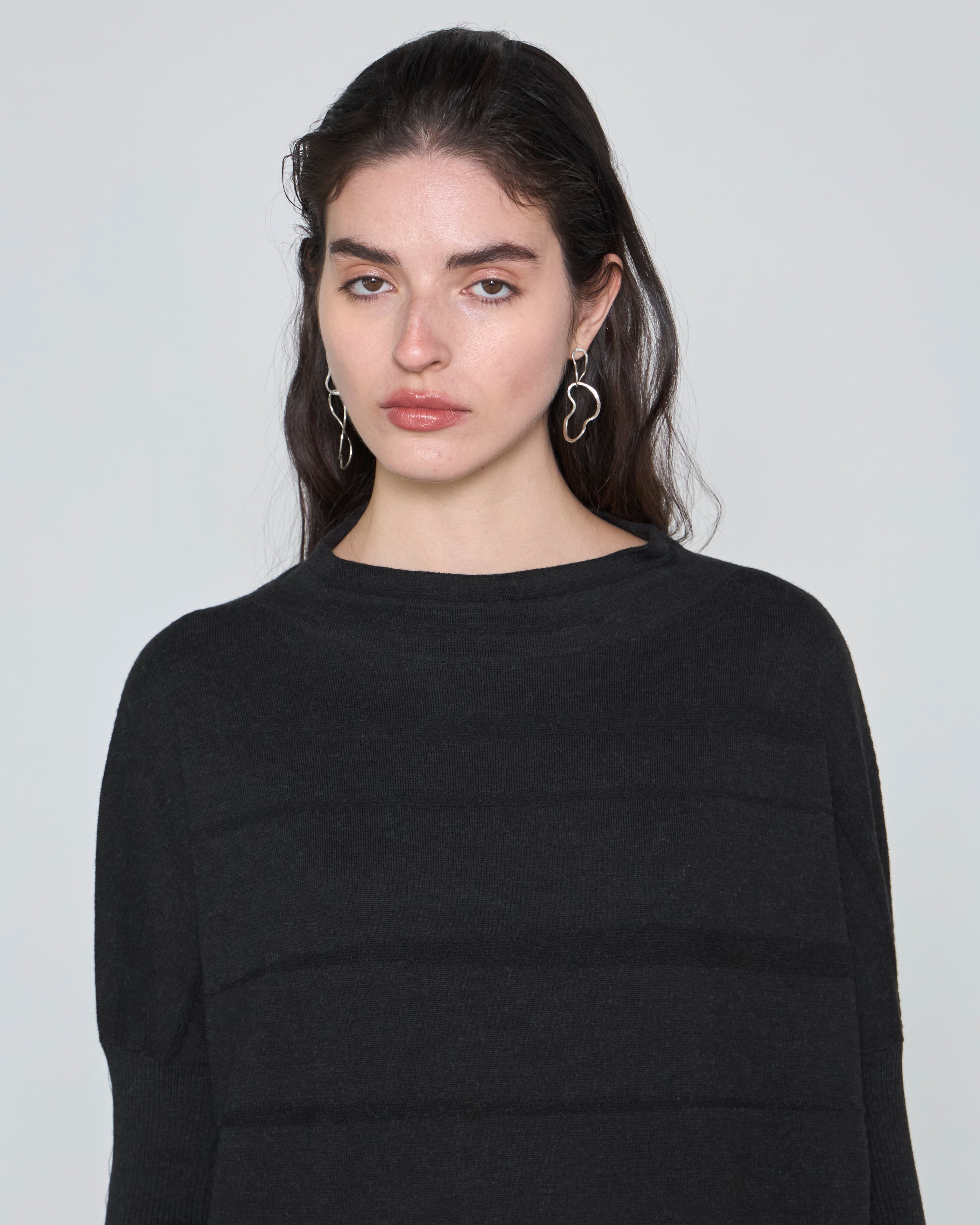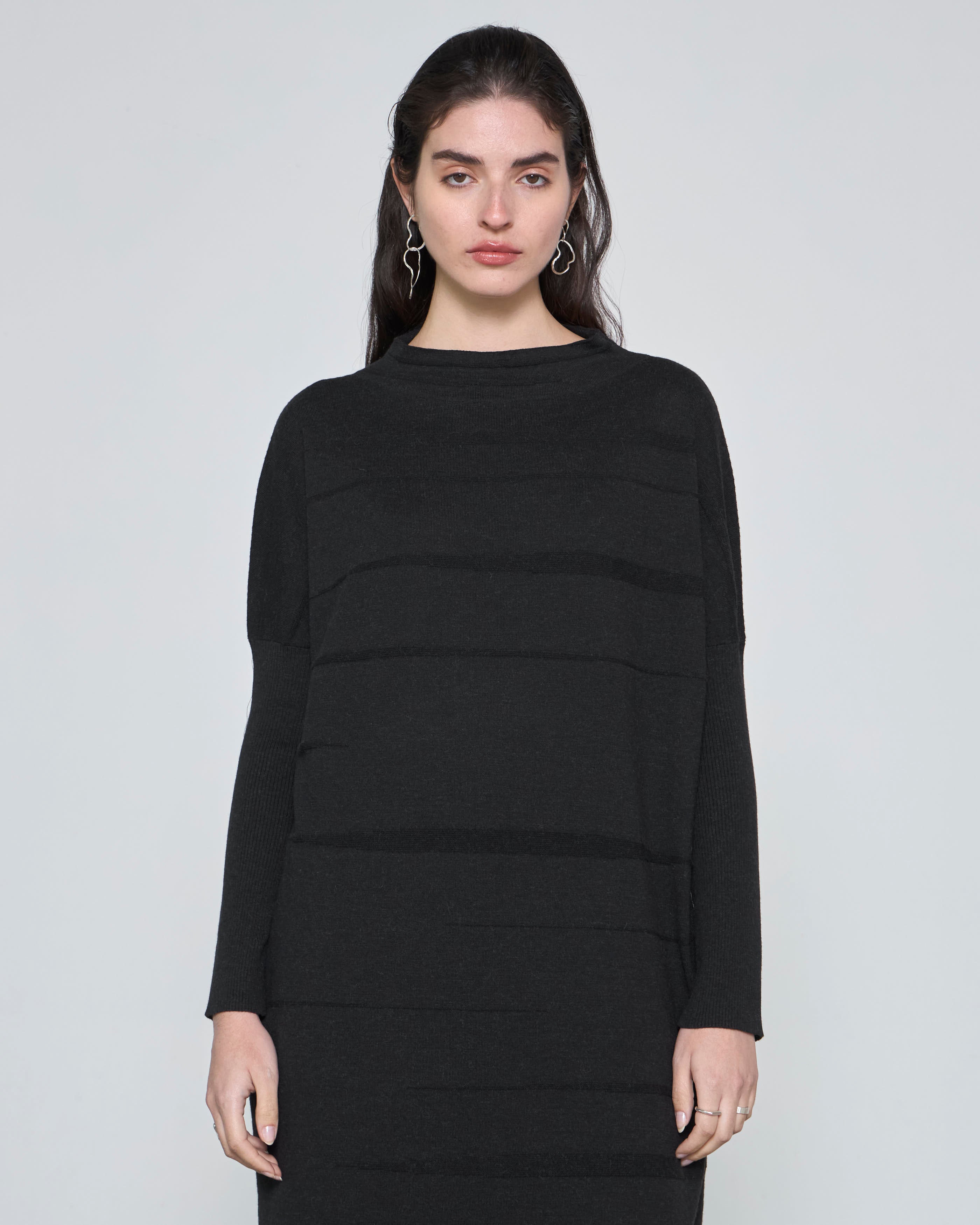 - Diseño fluido: escote alto y mangas rib, con una caída natural que aporta elegancia relajada.