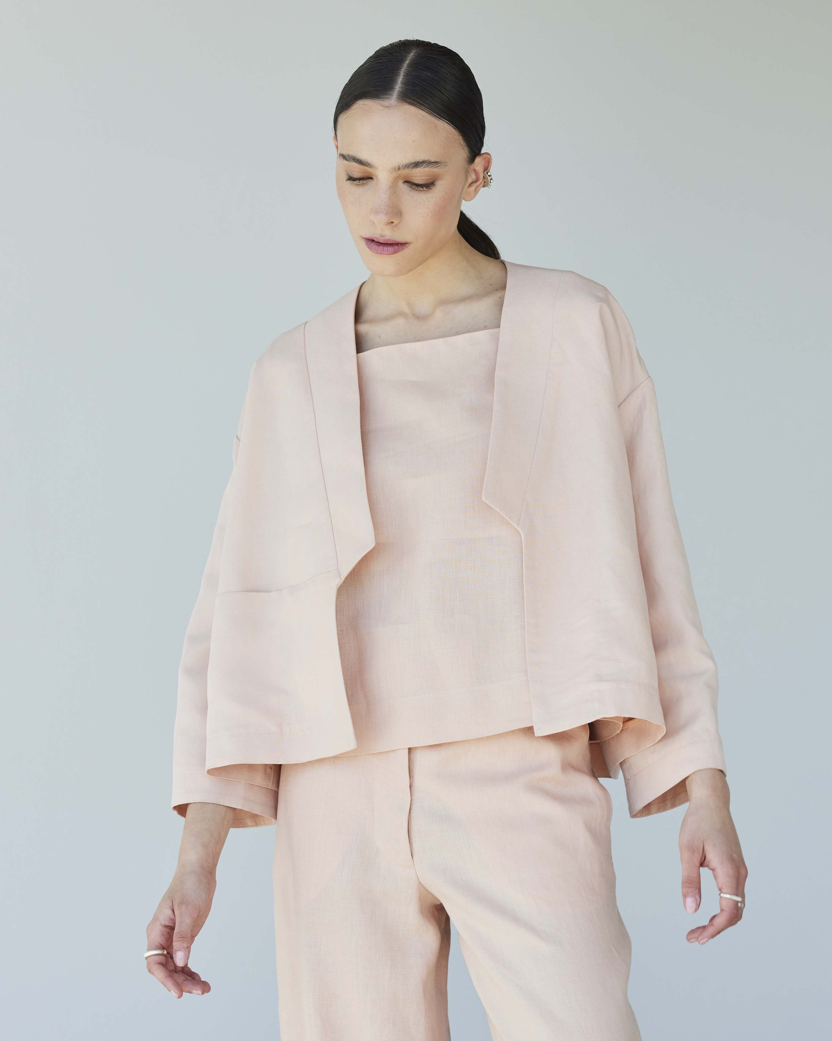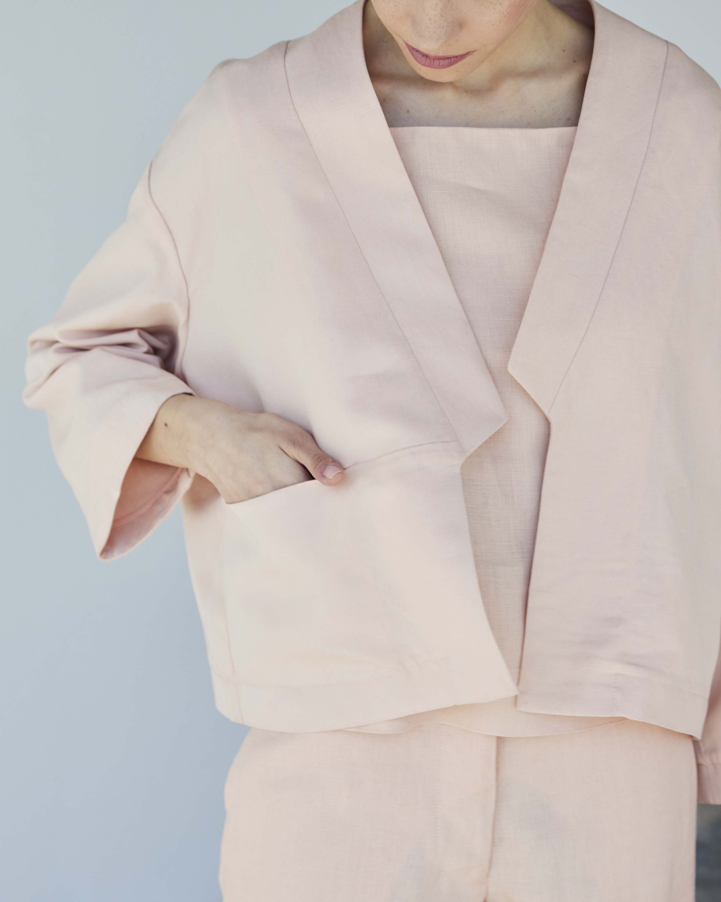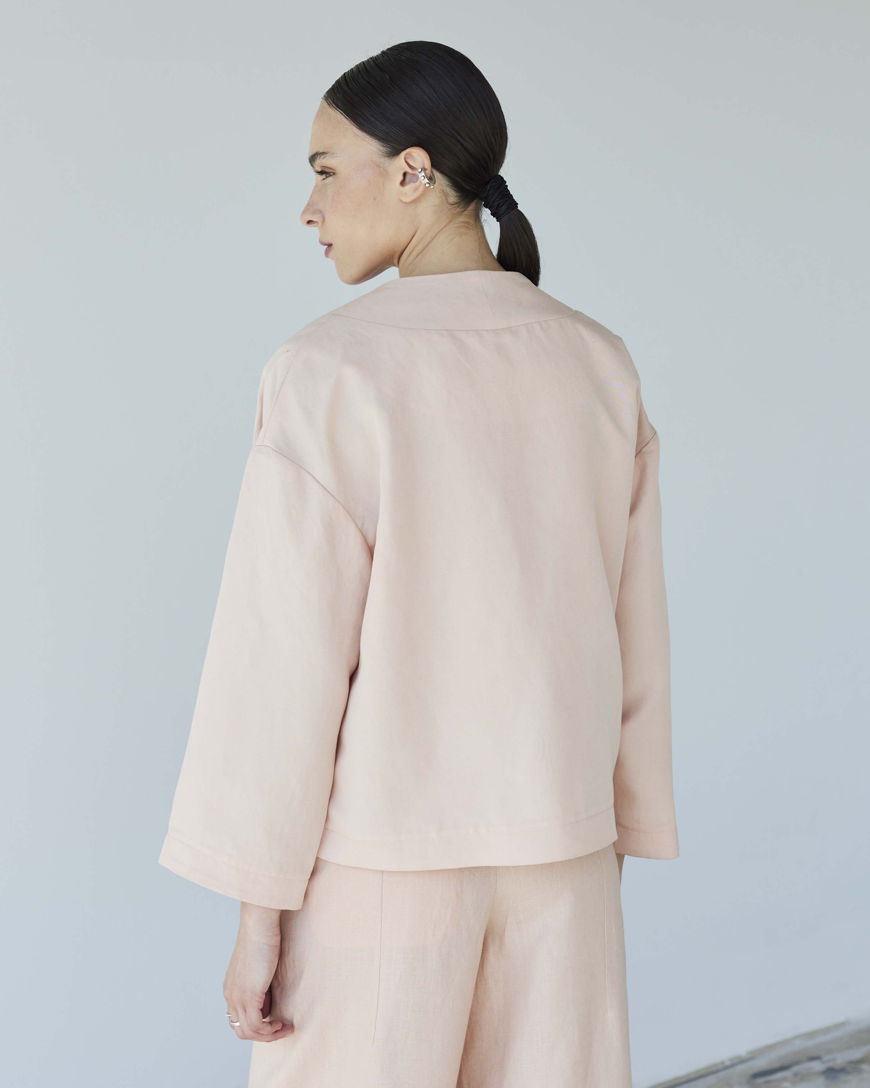 Chaqueta crop oversize, confeccionada en lino lyocell, una tela fresca y ligera, ideal para cualquier ocasión. Con solapas asimétricas y un bolsillo estilo parche.