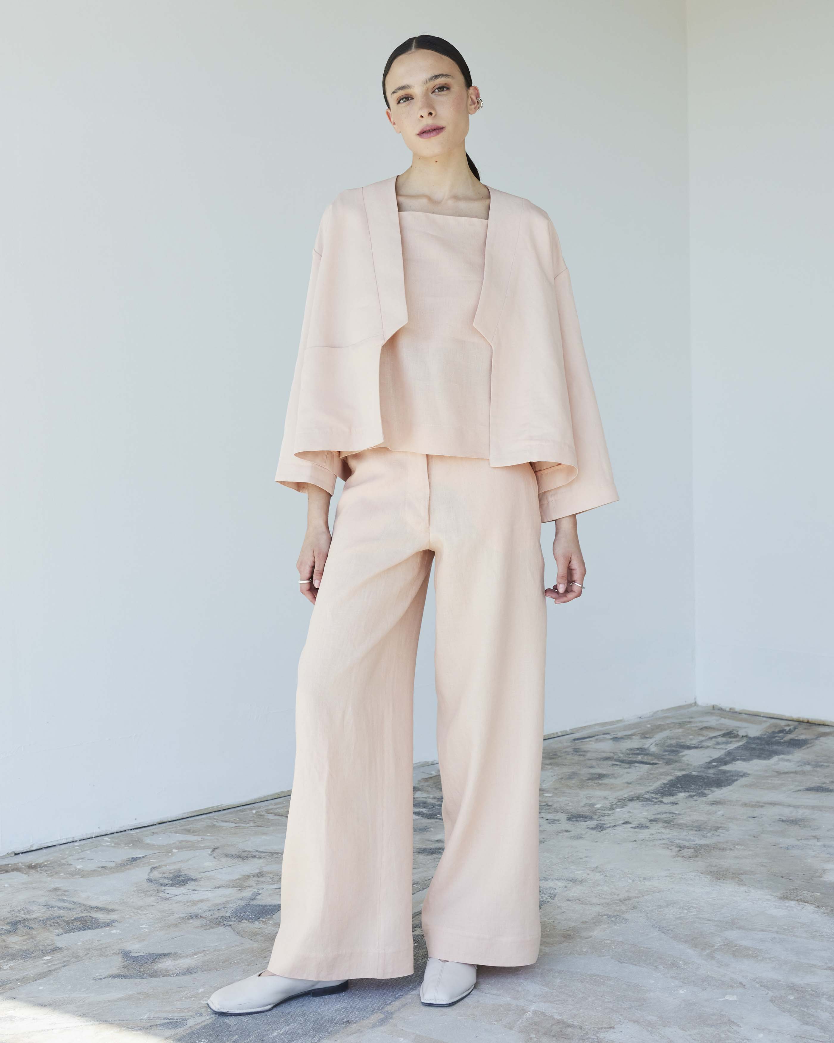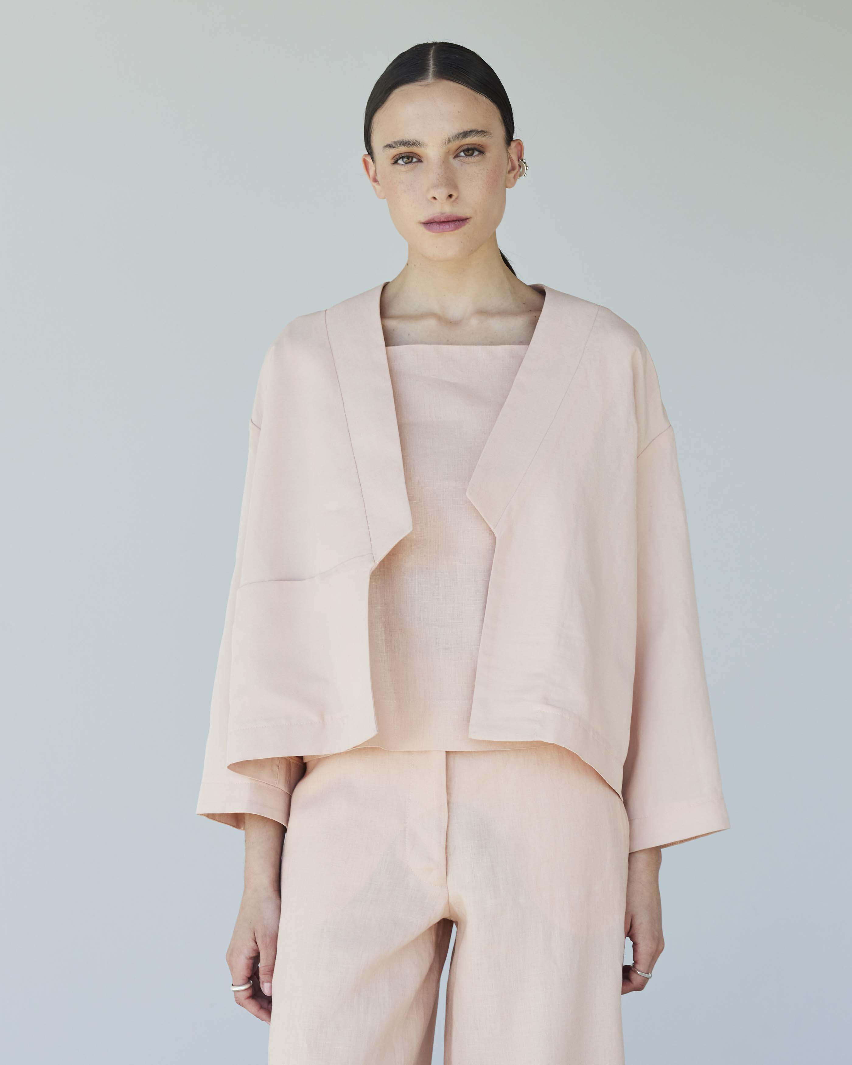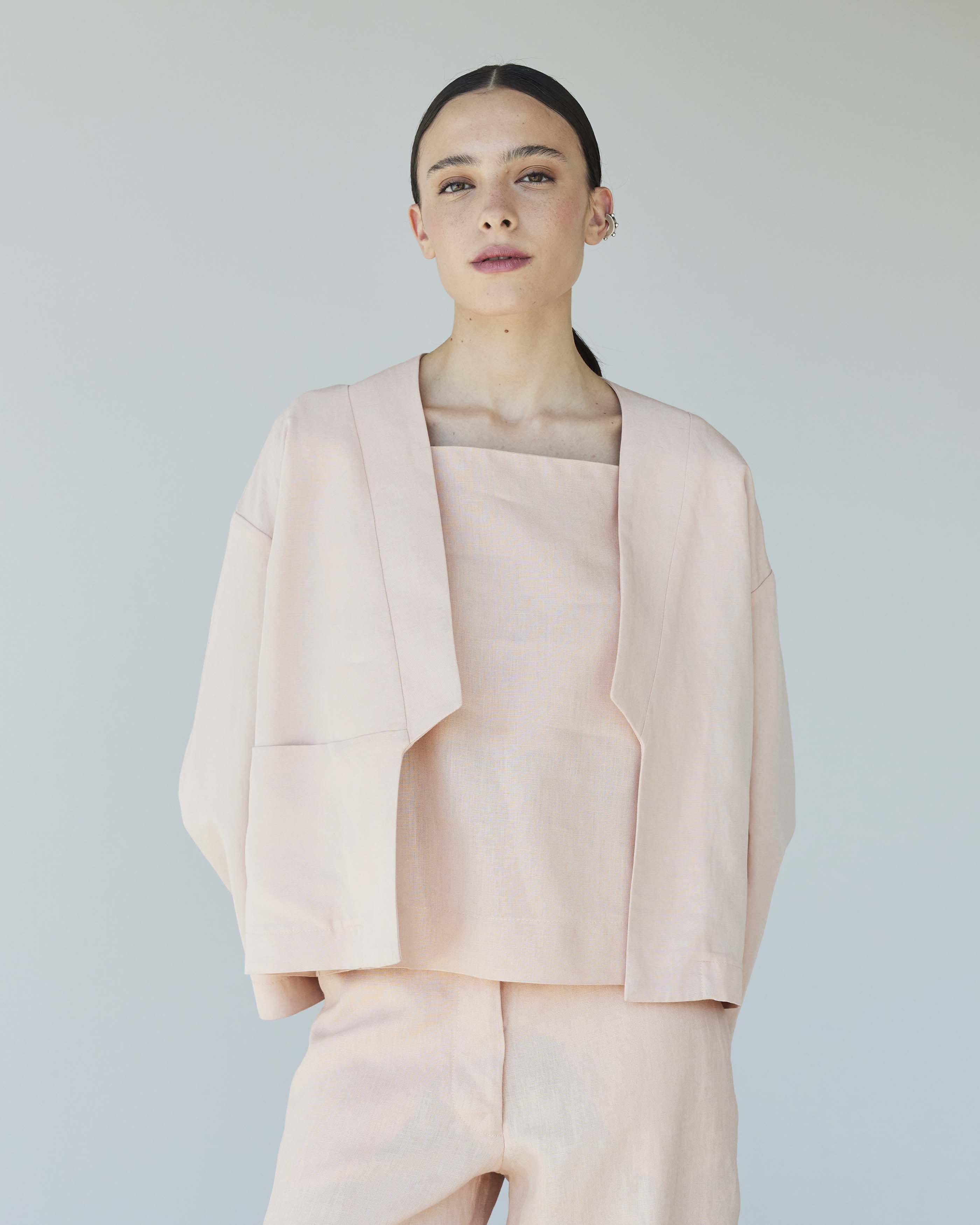 Chaqueta crop oversize, confeccionada en lino lyocell, una tela fresca y ligera, ideal para cualquier ocasión. Con solapas asimétricas y un bolsillo estilo parche.