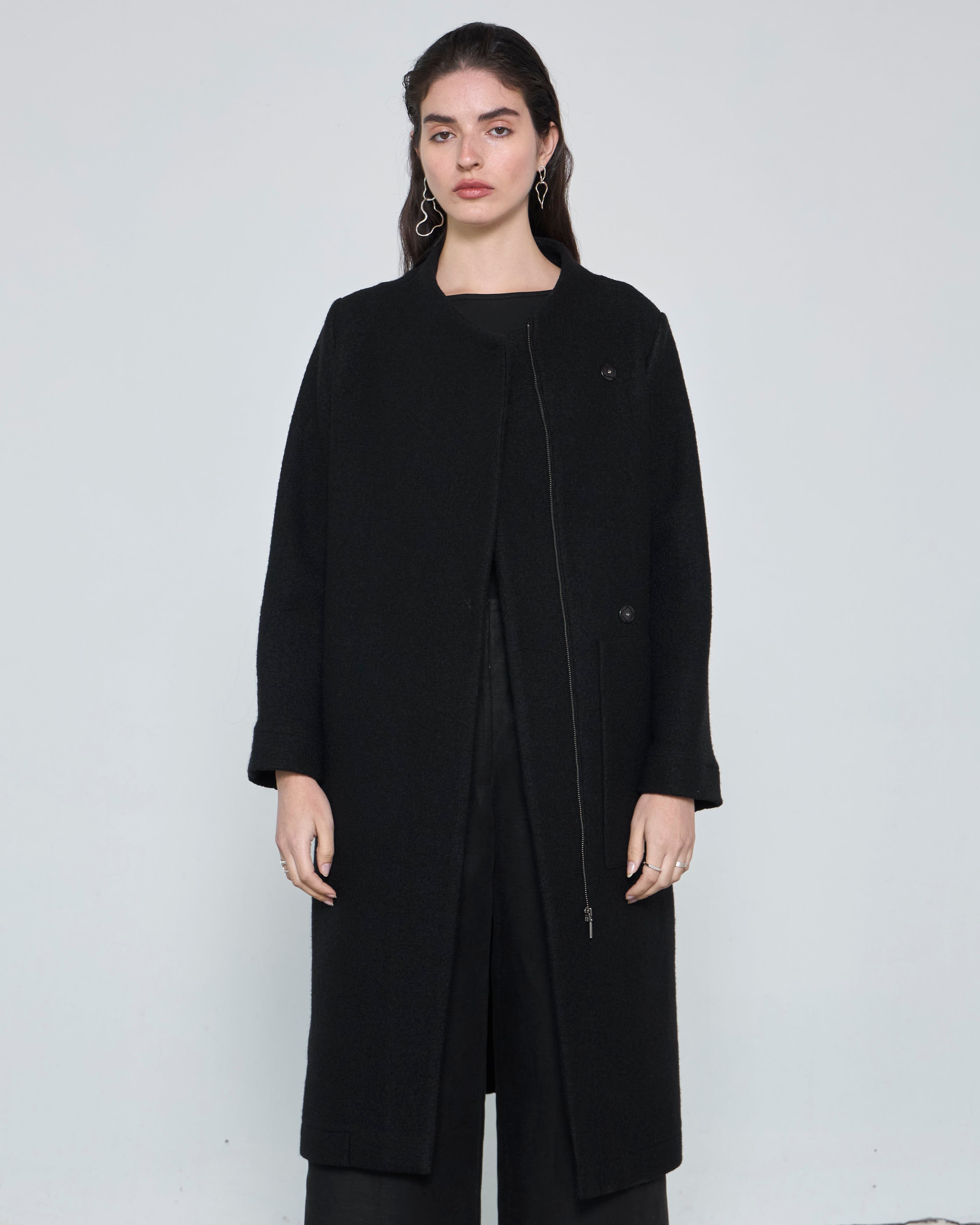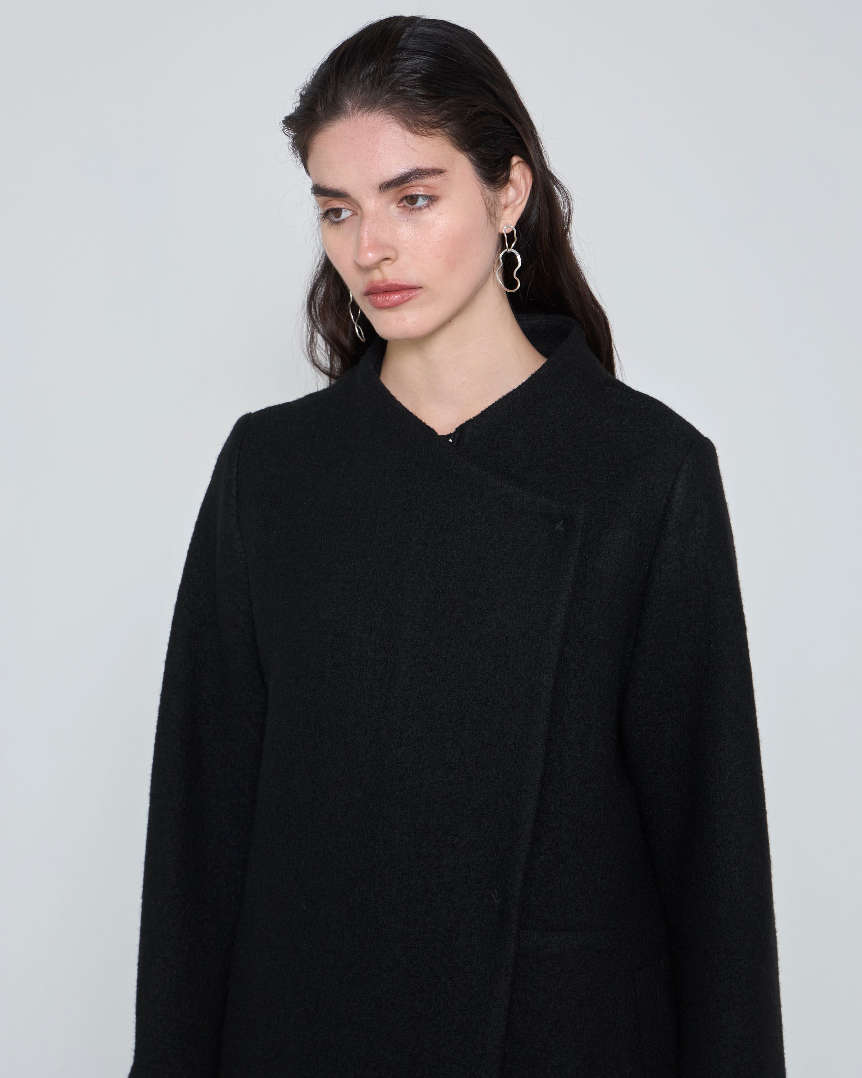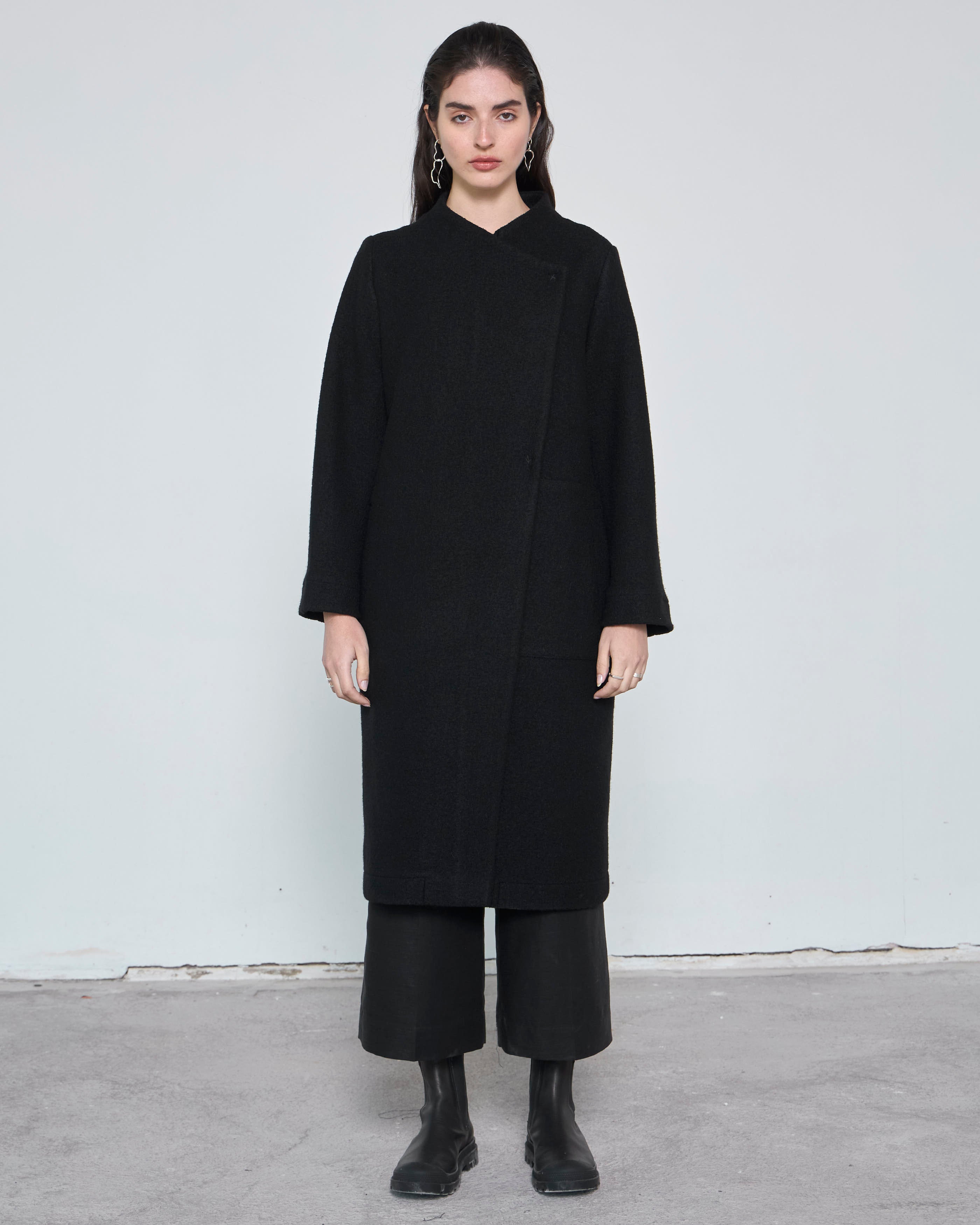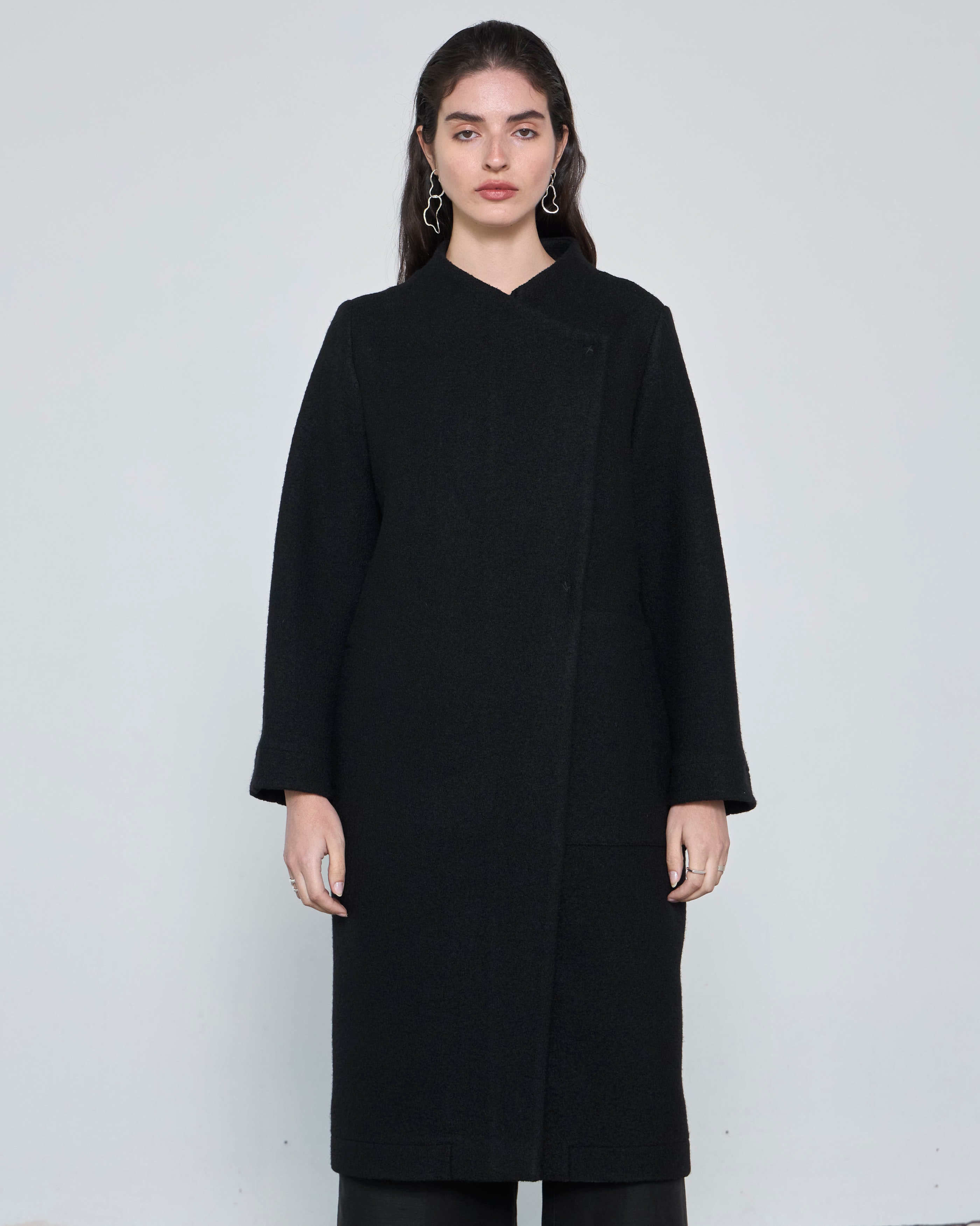 Con un diseño recto, escote de cruce asimétrico y cierre limpio y elegante, esta pieza combina silueta clásica y sofisticación contemporánea. Una prenda atemporal que ofrece un abrigo superior en los días fríos, manteniendo el sello de lujo y exclusividad de Pas Denom.