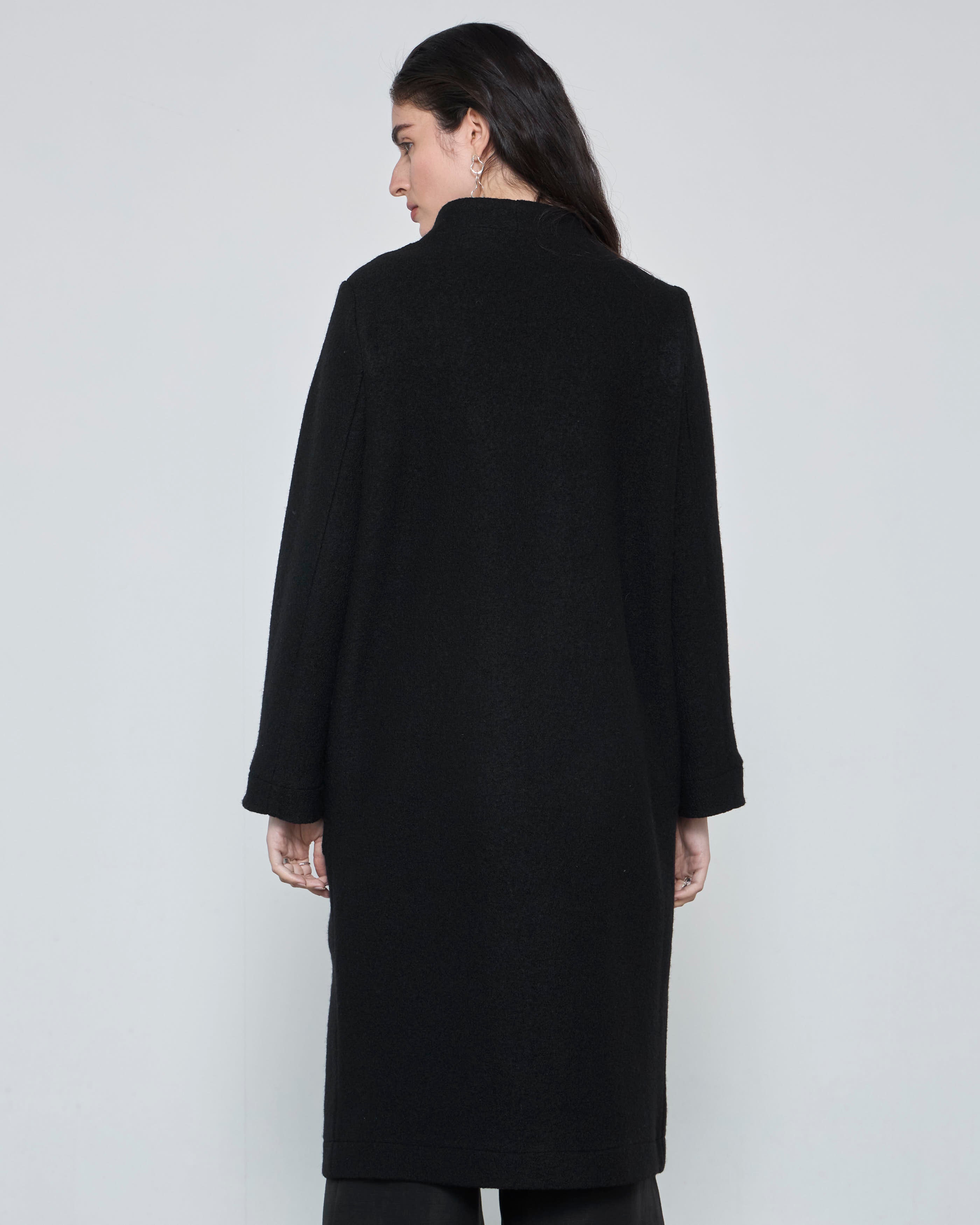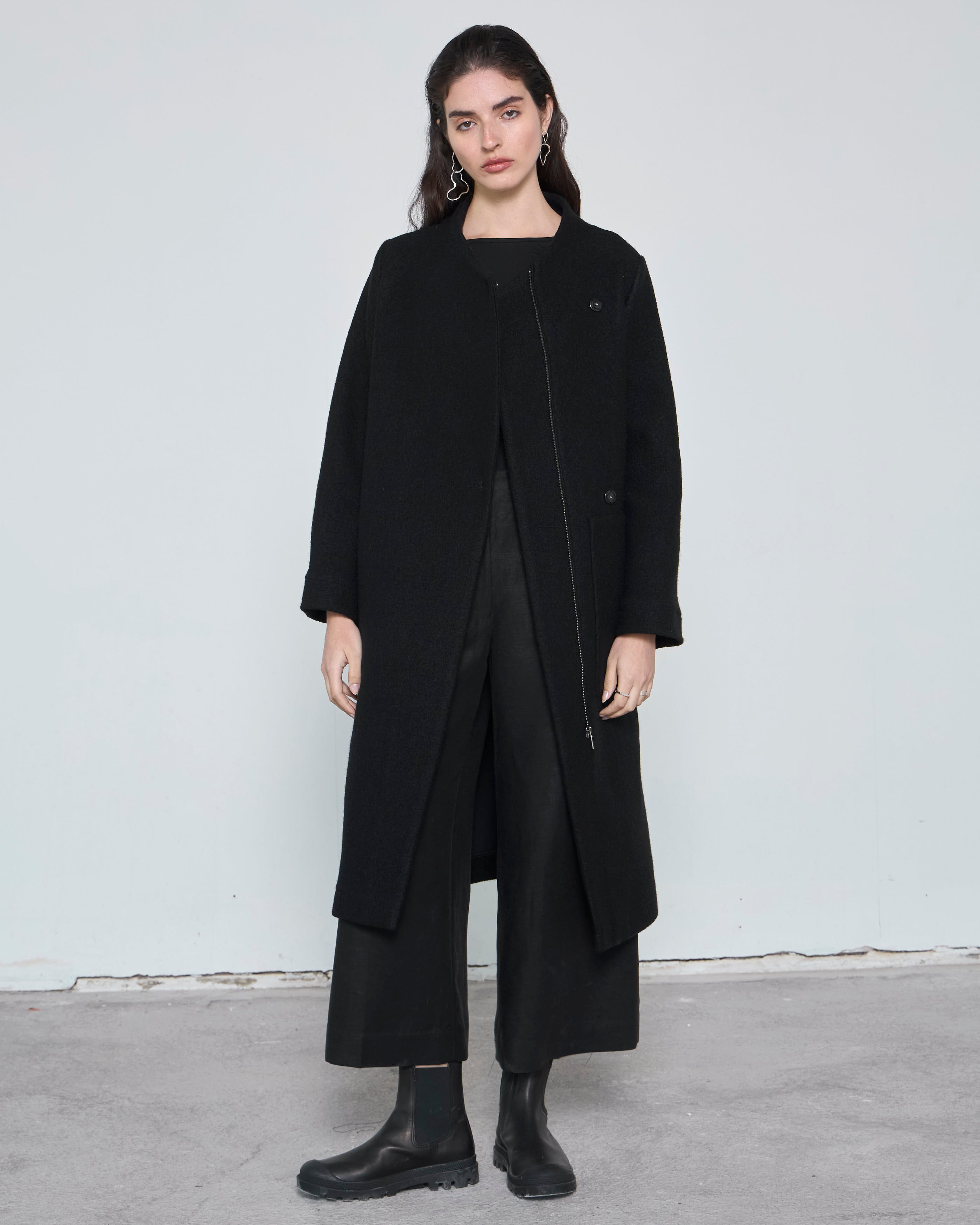 Abrigo de edición limitada confeccionado en 100% lana merino italiana, una fibra de lujo reconocida por su suavidad, calidez y elegancia. Su proceso de batanado refuerza la estructura del tejido, aportando mayor durabilidad sin perder fluidez ni suavidad al tacto.