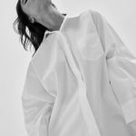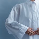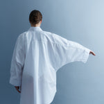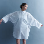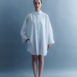 La camisa diseñada por la historiadora de moda Pia Montalva en colaboración con Pas Denom. Esta prenda oversize, con aplicaciones en tul, abotonadura escondida y bolsillos. Se destaca por su cuello camisero clásico y su diseño largo, lleno de detalles sutiles, que permite ser usada tanto como una camisa oversize o como vestido.