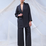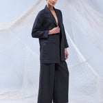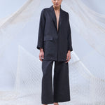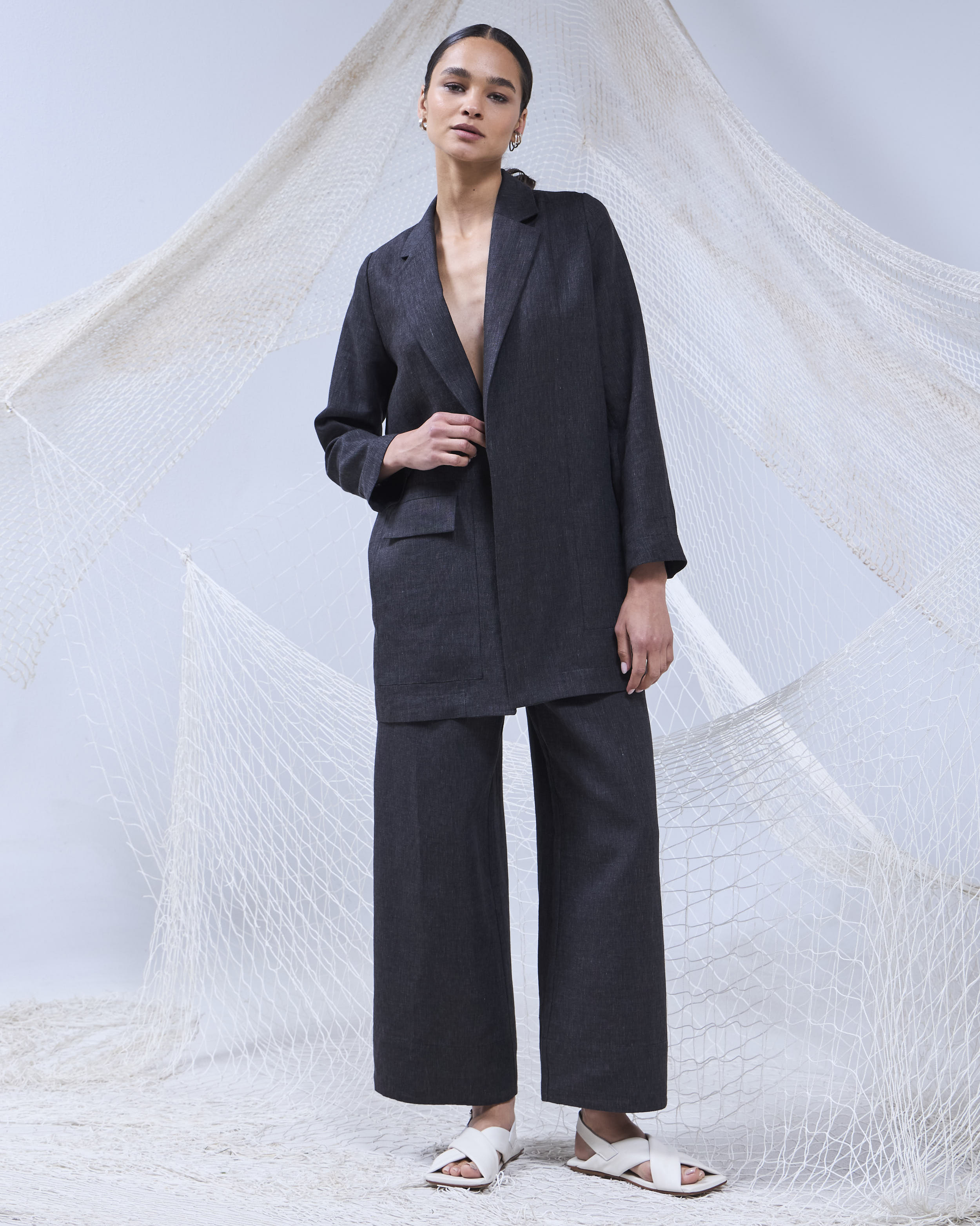 Confeccionado en 100% lino, el blazer SASHIKO tiene calce recto, solapas largas y diseño abierto que crea un escote pronunciado y elegante.