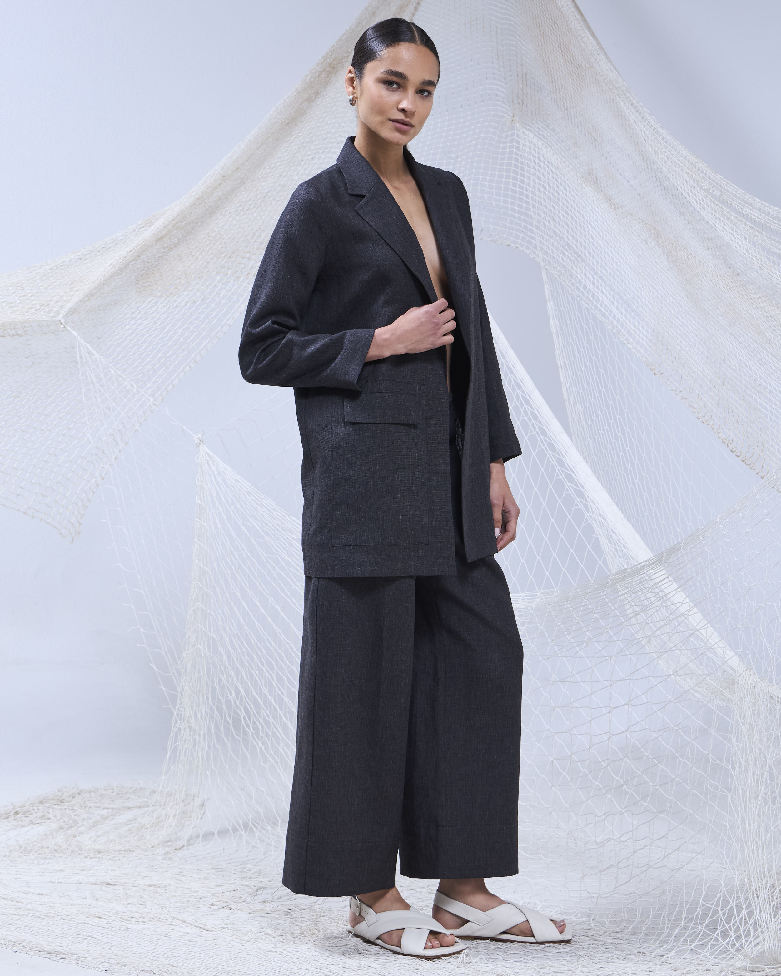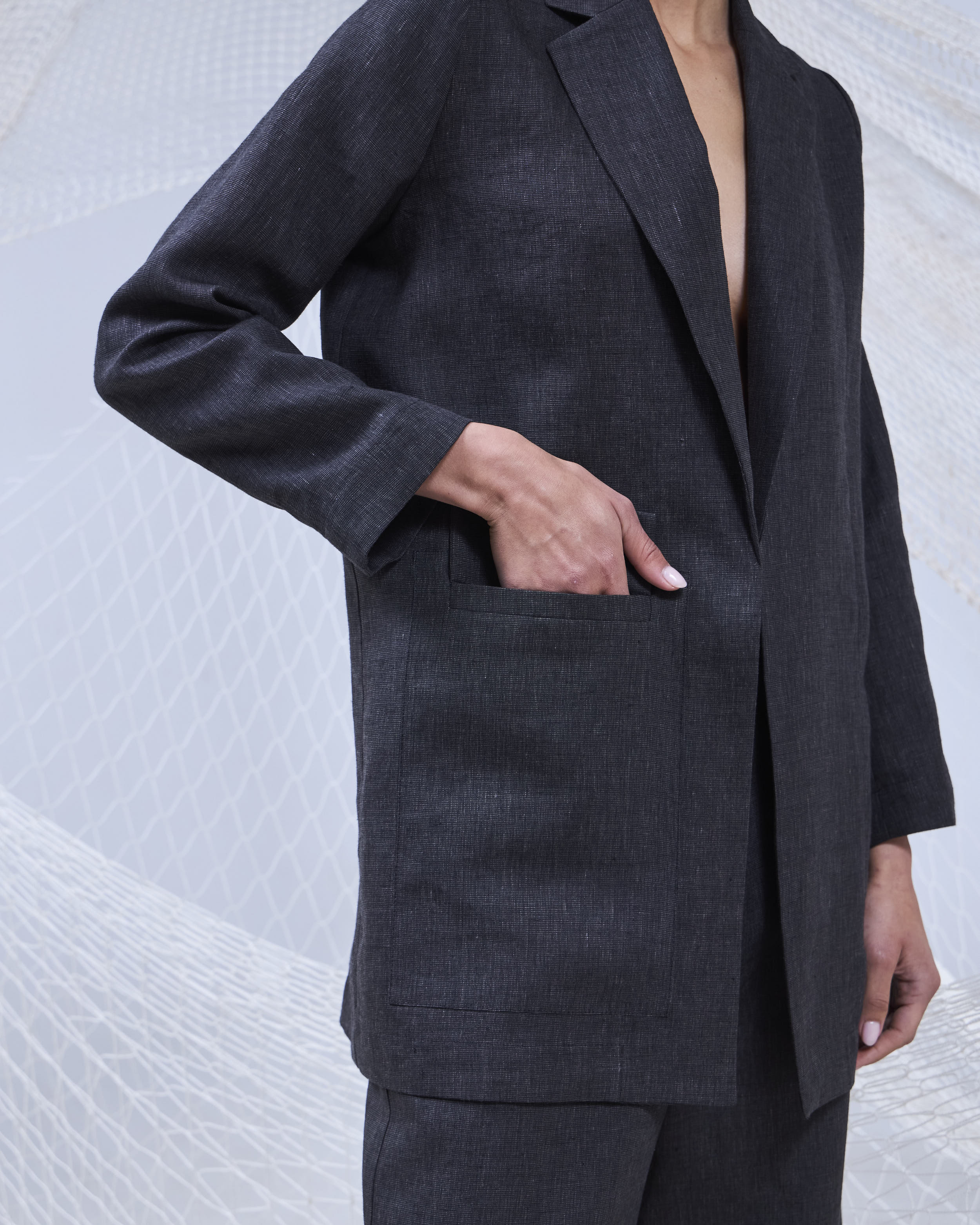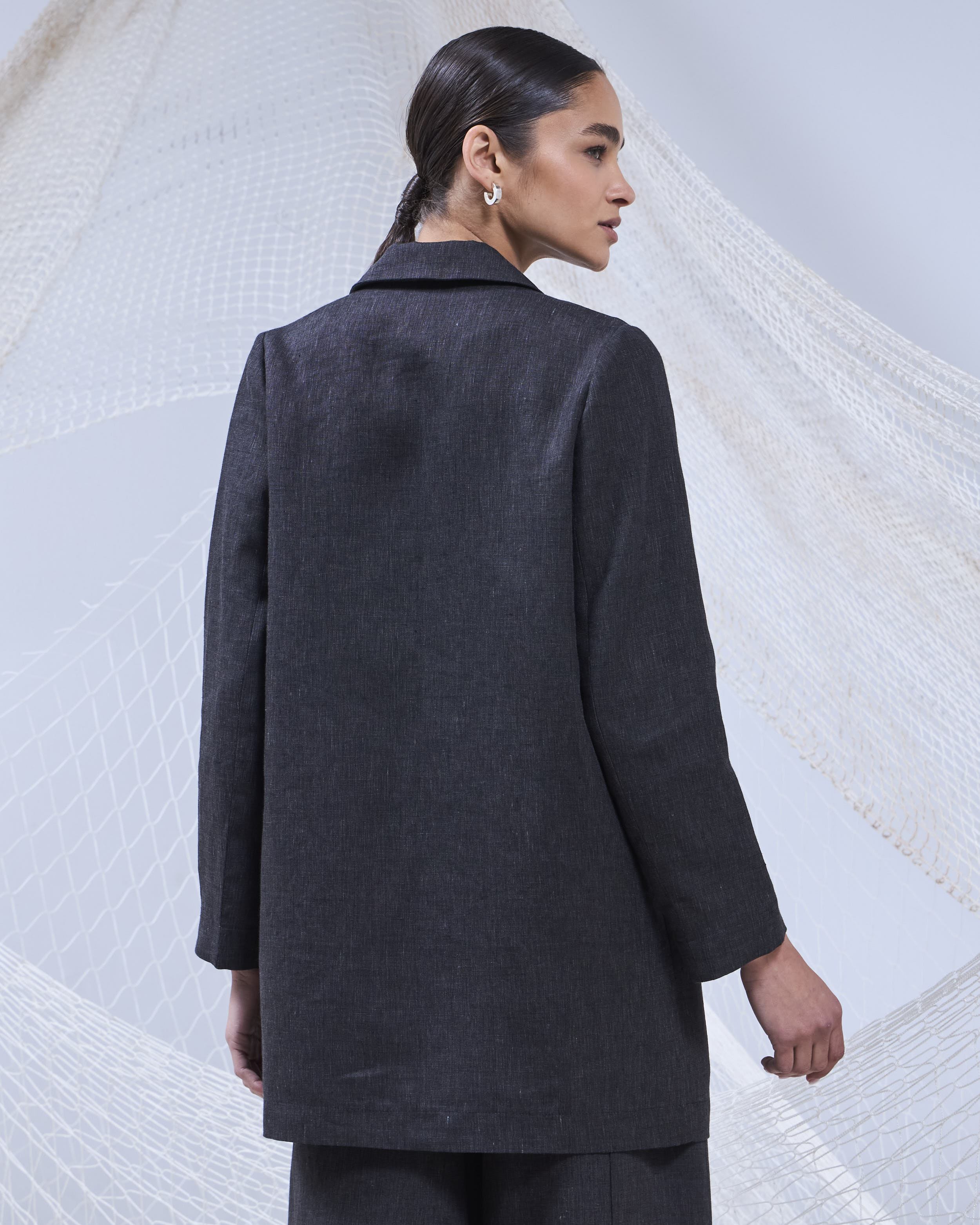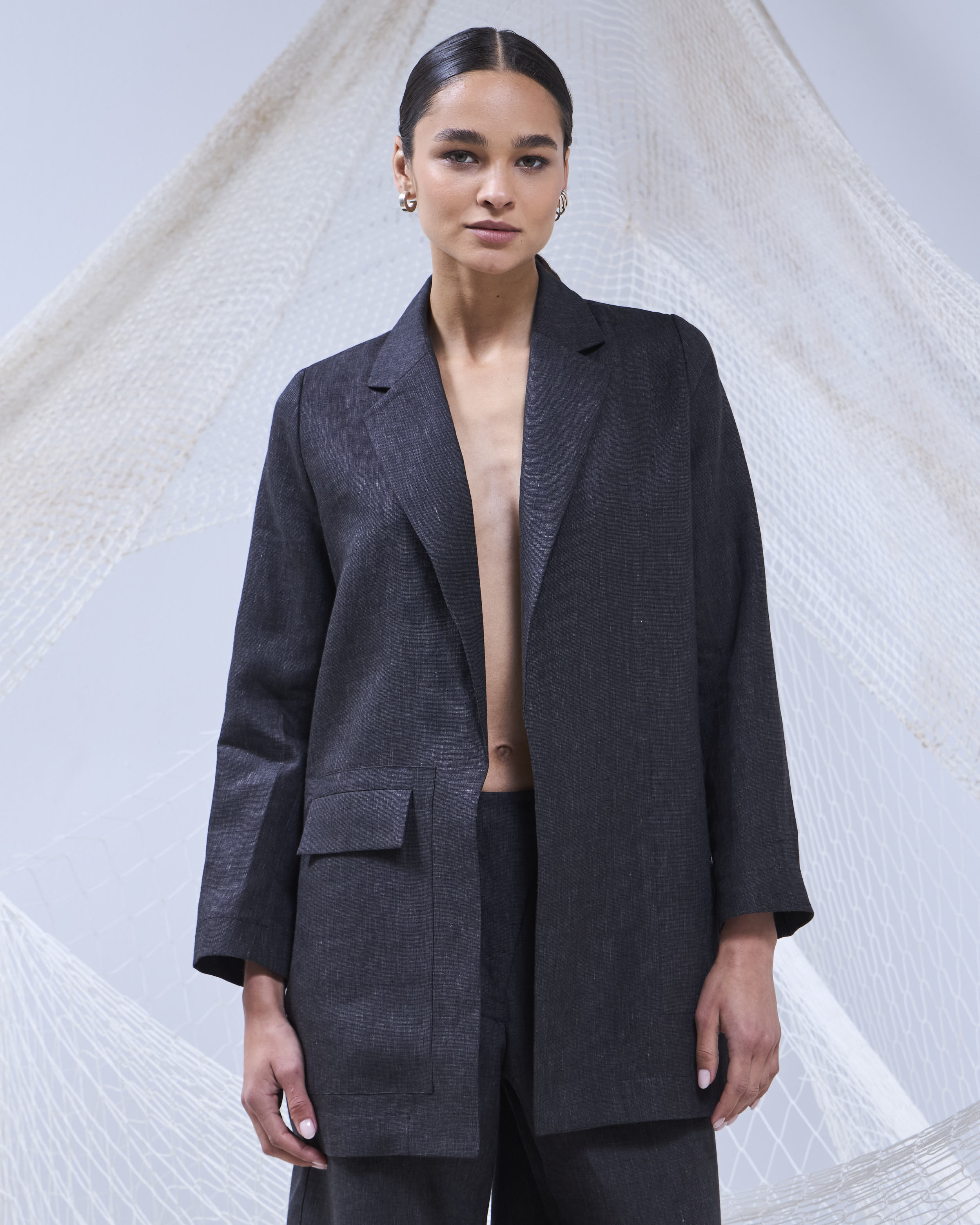 Su silueta cae hasta la cadera, integrando un único bolsillo lateral que aporta un gesto minimalista y funcional. Esta proporción lo convierte en una prenda versátil y sofisticada, que estiliza la figura y transmite una actitud contemporánea y relajada a la vez. Su confección en lino aporta una caída fluida y una textura sutilmente orgánica que realza el diseño.