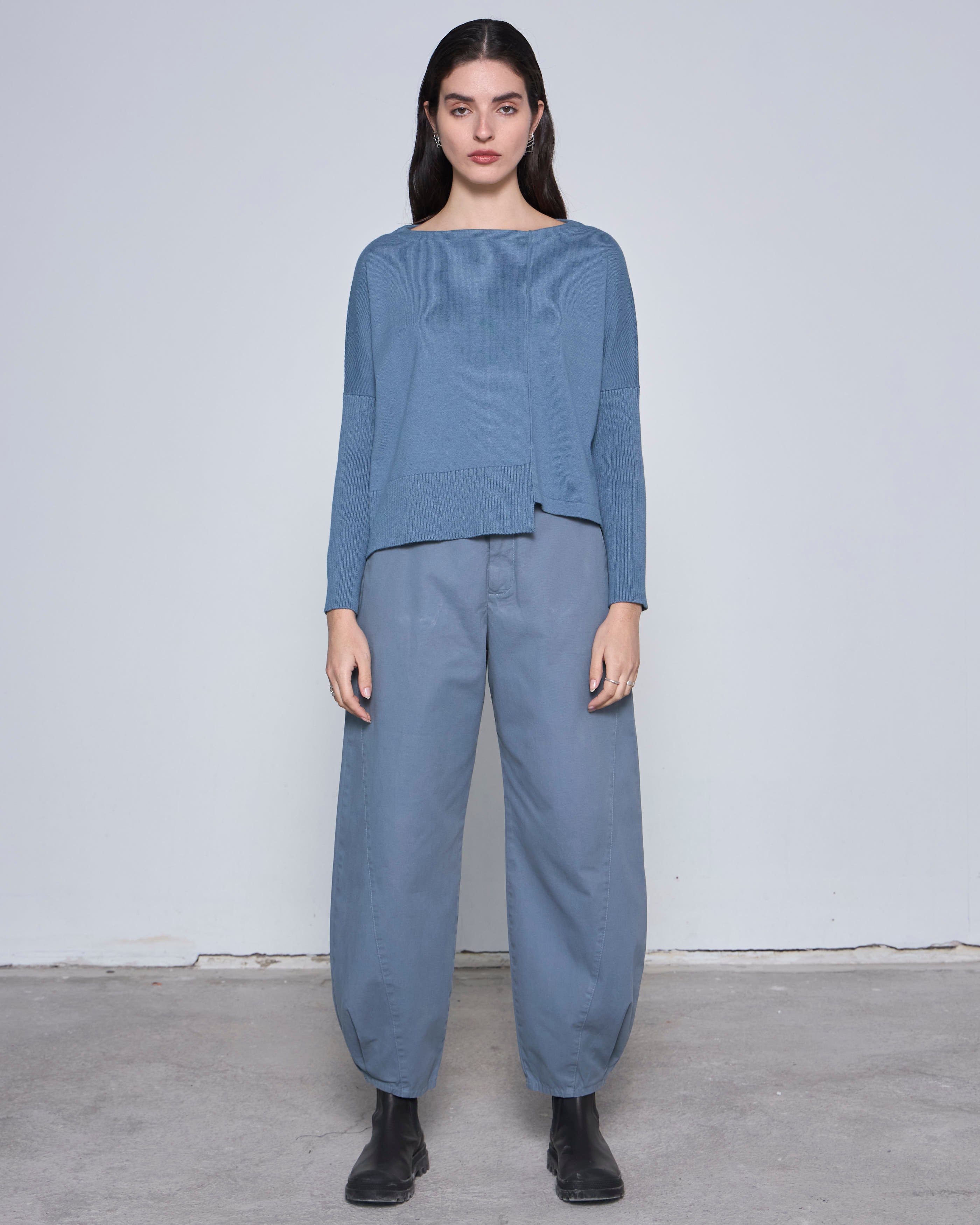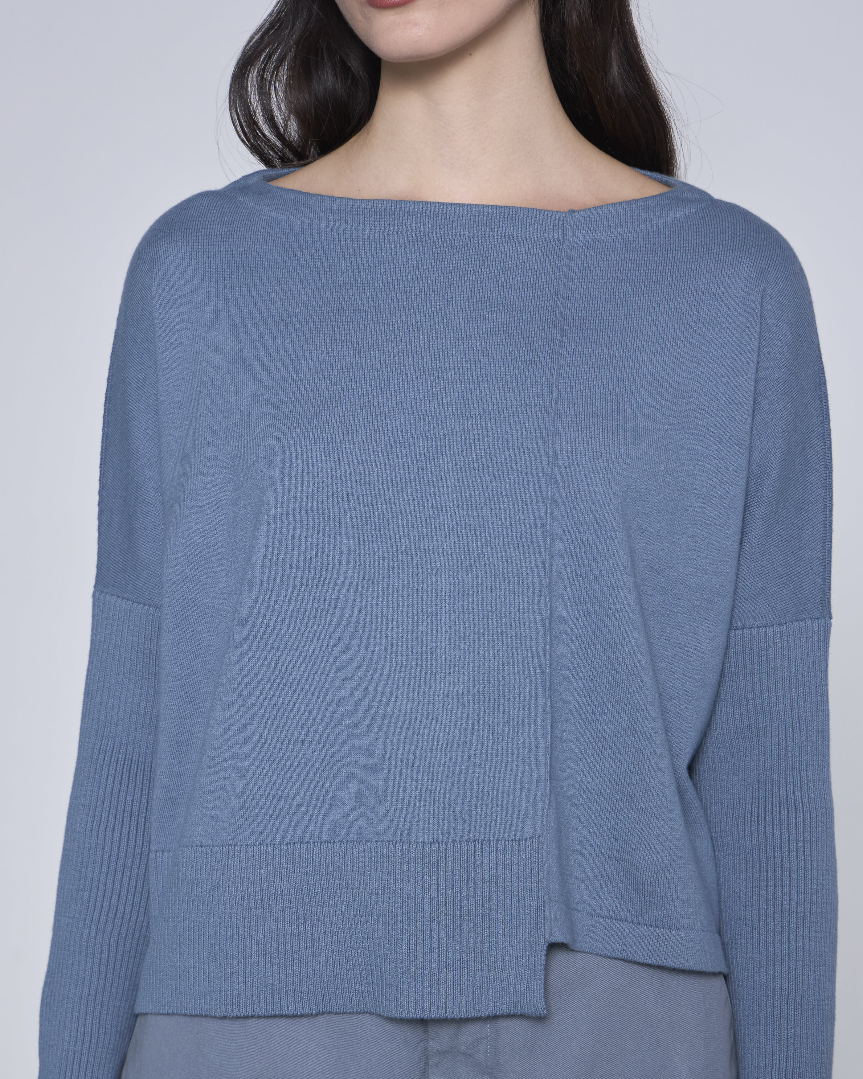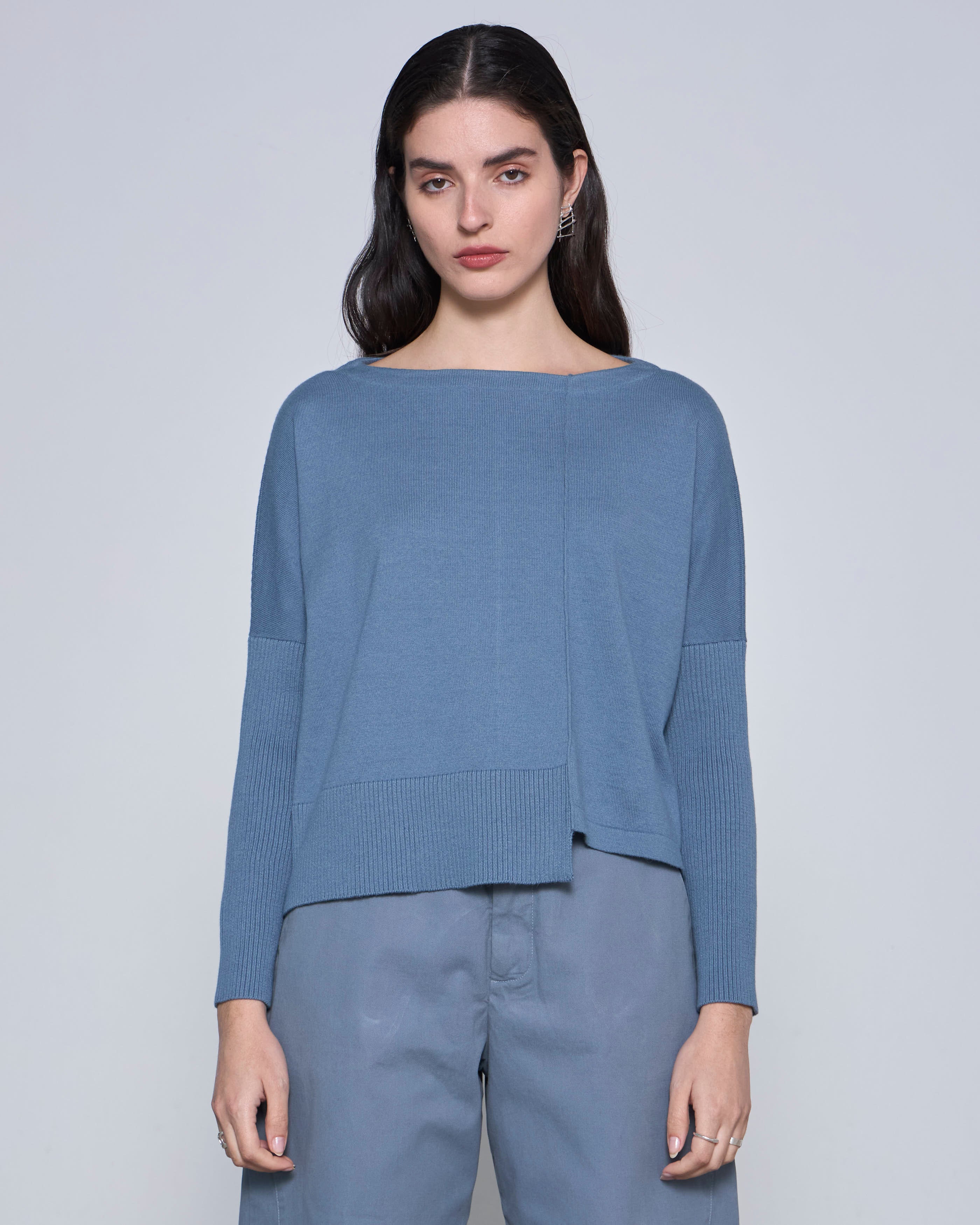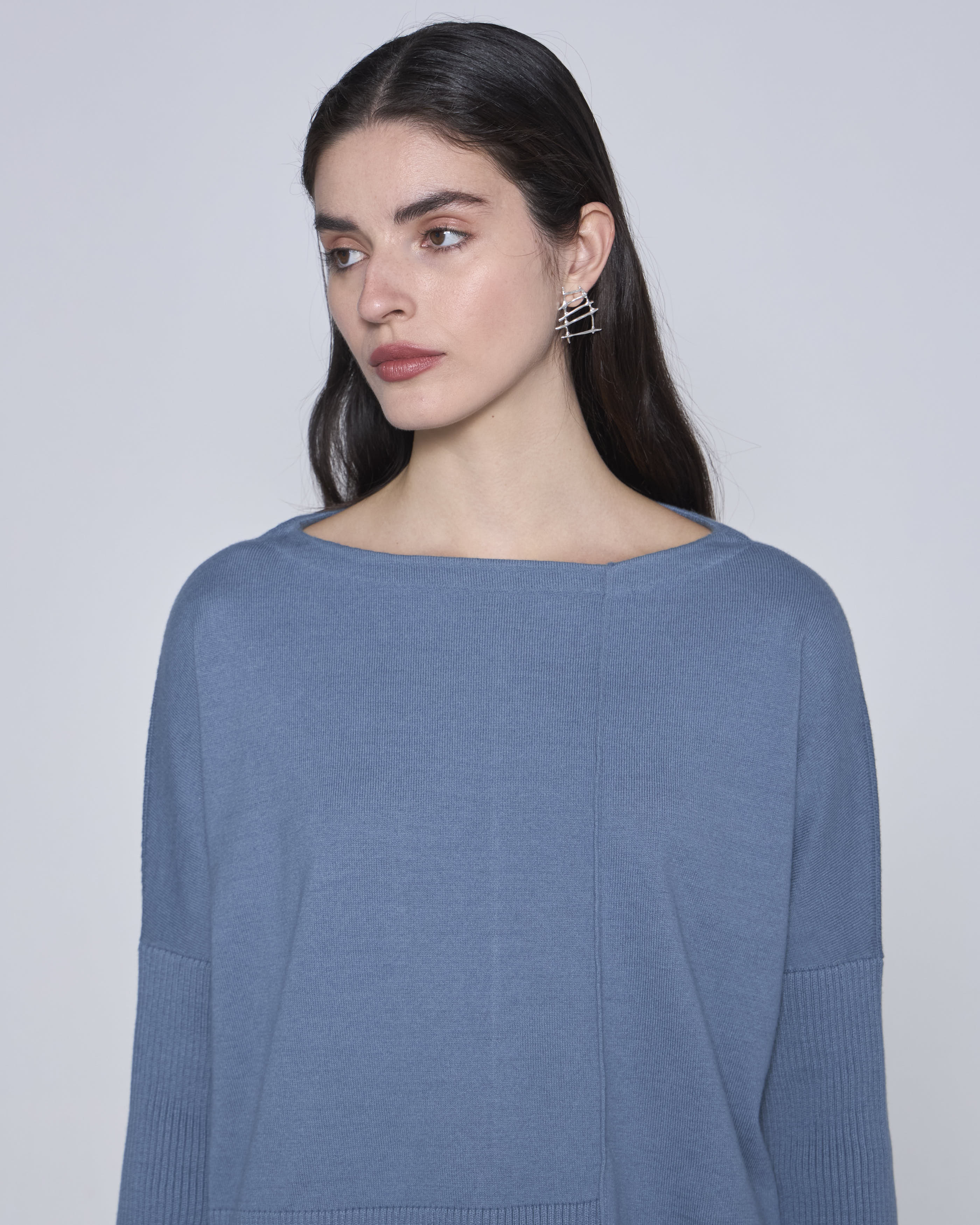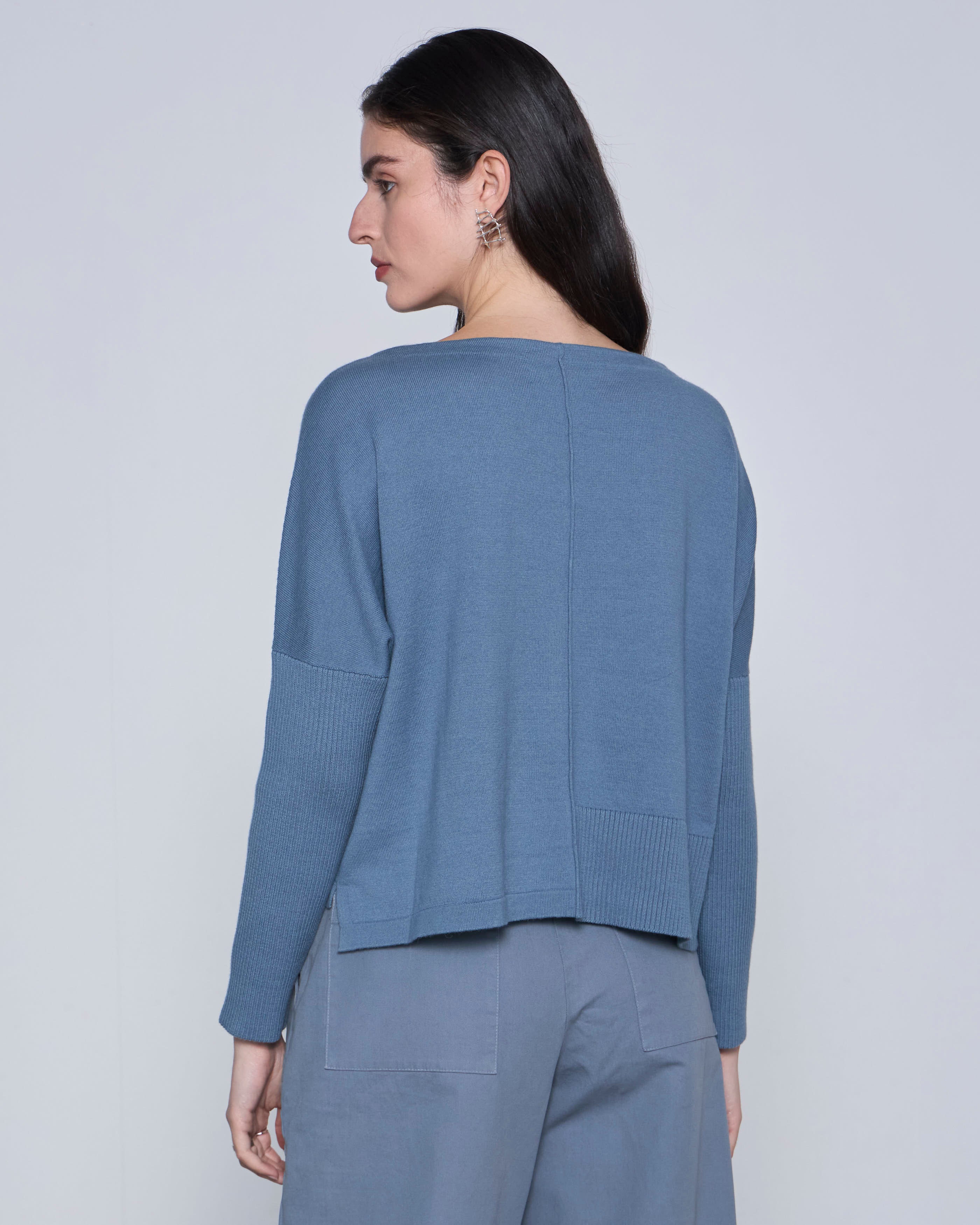 Nuestro Crop Top tejido es una prenda única que fusiona el diseño asimétrico con la suavidad del algodón pima y la calidez de la baby alpaca. Su escote bote, manga larga con rib y hombro caído crean una silueta relajada y sofisticada, mientras que los detalles en rib aportan textura y estructura.